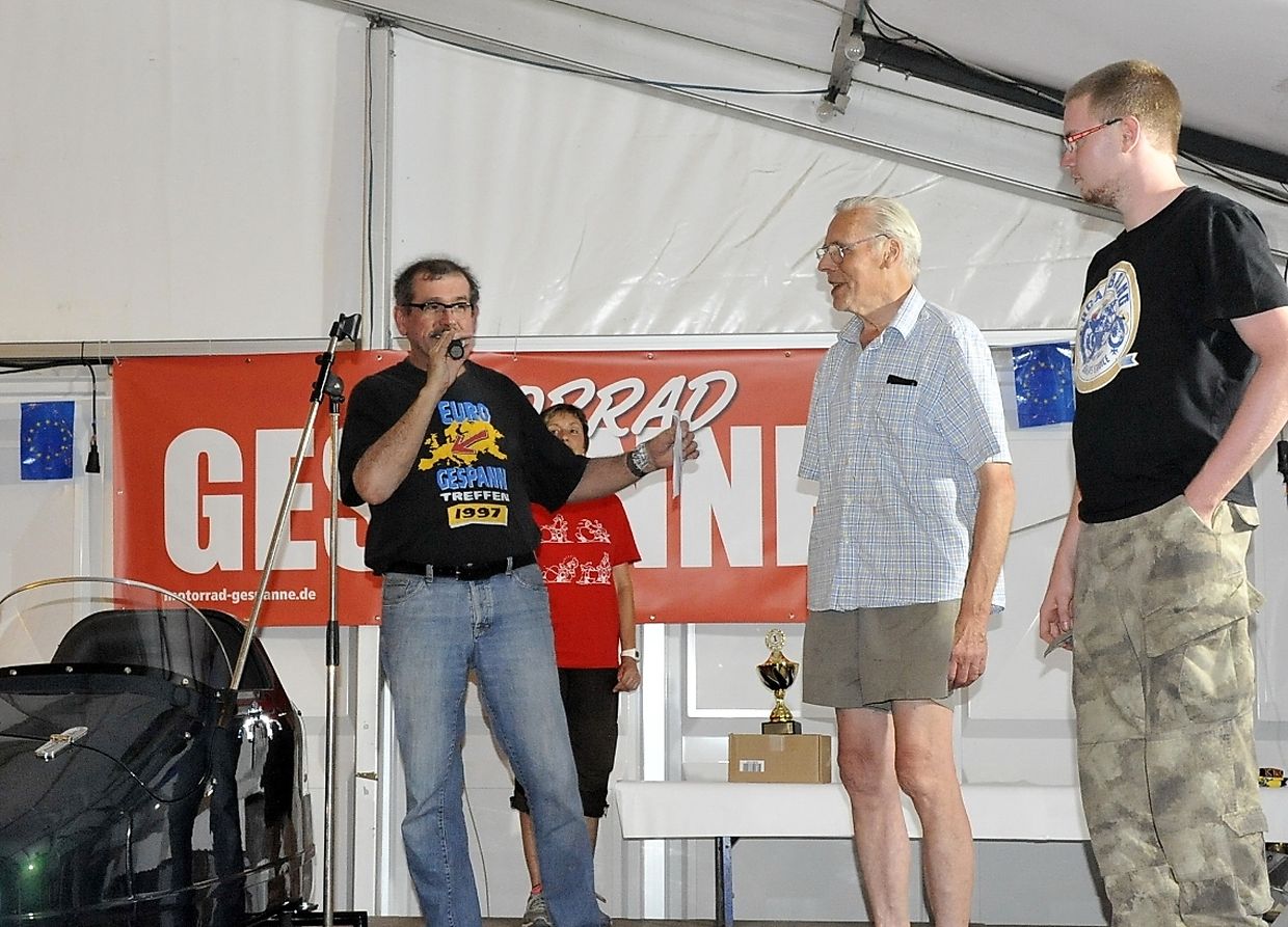 Drei Tage - drei Räder, unter diesem Moto fand erneut das Euro Gespann-Treffen E G T in Weiswampach am letzten Wochenende im Monat August statt. Mit 1489 Fahrzeuge aus ganz Europa nebst Familie (etwa 2400 Personen) trafen sich erneut zum siebten Mal am See. An einem Eigenbau-Wettbewerb von interessanter Kombination sowie Konstruktion, konnte sich unter internationalen Gespannfahrern beraten sowie ausgetauscht werden. Ein interessanter Rundgang über den Platz bot viele Gespannvariationen. Eine traditionelle Verlosung gehört jedesmal zum Treffen dazu, womit es viele tolle Preise zu gewinnen gibt, und als Hauptgewinn sogar einen Beiwagen. Pokale für die weitesten Anfahrten, erhielten Oddbjörn Tangen, Norwegen 1709 km, Karsten Hjellbakk, Norwegen 1693 km, Jo Dubrunfaut Frankreich 1200 km.Weitere Pokale für die ältesten Gespanne mit mehr als 100 km Anfahrt ging an Kurt Nelles, Nimbus-Gespann Baujahr 1939, Wieland Fischer BMW R75 Sahara Baujahr 1943, Martin Klimmer, Ural M72 Baujahr 1949 . Geehrt wurde der älteste Gespannfahrer mit mind. 100 km Anfahrt Eberhard Lübke, 83 Jahre, sowie der jüngste Gespannfahrer Stefan Job, 20 Jahre. Weitere Prämien gingen an die tollsten Gespann-Eigenbauten. Die nächste Ausgabe zum Euro-Gespann- Treffen in Weiswampach wurde bereits im Kalender für 2017 festgelegt.