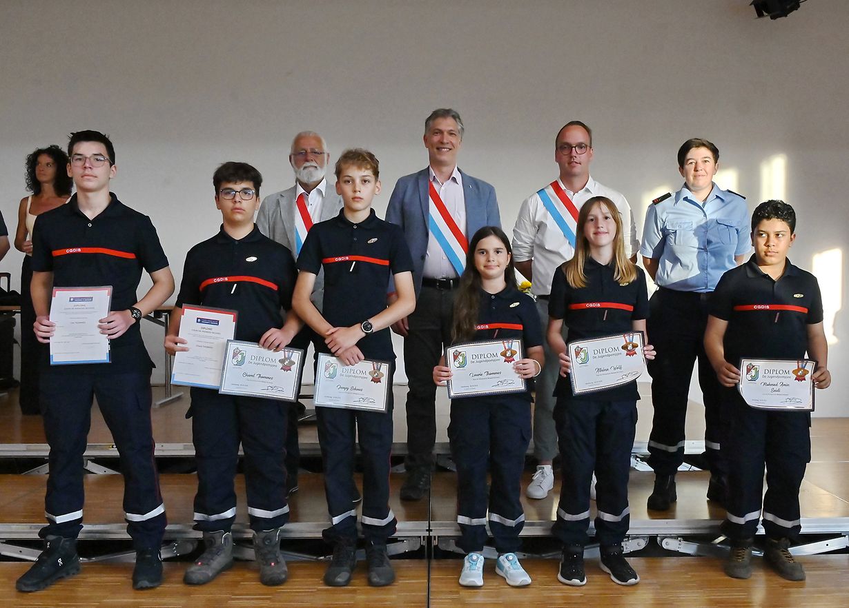 Bürgermeister Néckel Polfer, im Beisein der beiden Schöffen Mike Hahn und Mario Dichter sowie Leiterin der Jugendfeuerwehr CIS Weiswampach, Nadia Huet, kennzeichneten Jugendliche für ihre besonderen Leistungen und vorbildliches Engagement mit Urkunden aus.