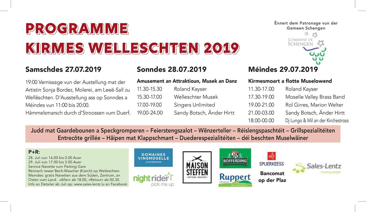 19:00 Vernissage vun der Austellung mat der Artistin Sonja Bordez, Molerei, am Leeë-Sall zu Wellëschten. D’Ausstellung ass op Sonndes a Méindes vun 11:00 bis 20:00.