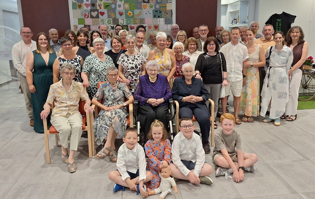 D'Sanny Rausch-Meier huet e Samschdeg den 19. Juli hir 100 Joer zu Wooltz an der Geenzebléi am Servior gefeiert, wou si zënter Oktober 2023 mat Kompetenz an Dévouement betreit gëtt. Zu Zerf am Ruwerdall as si als 2. Kand vun enger kannerräicher Bauerefamill op d'Welt komm. An de Nokrichsjore koum si bei d'Famill Bodé op Bauschelt schaffen an ass do hänke bliwwen. 1950 mam Pol Rausch bestuet , hunn déi zwee hir Famill gegrënnt, op déi d'Sanny haut ganz houfreg ass an op déi de Pol zënter September 1998 vum Himmel aus oppasst: 4 Kanner, d'Pauline, de Jos, d'Agnes an d'Germaine , 6 Enkelkanner an 8 Urenkel. All waren si op der 100-Joer-Feier derbäi. Och hir 2 jéngst Schwësteren, Neveuen an Niesse waren um Fest derbäi fir dem Sanny vill Gléck a vill Seege fir de Rescht vun hirem Liewen ze wënschen.