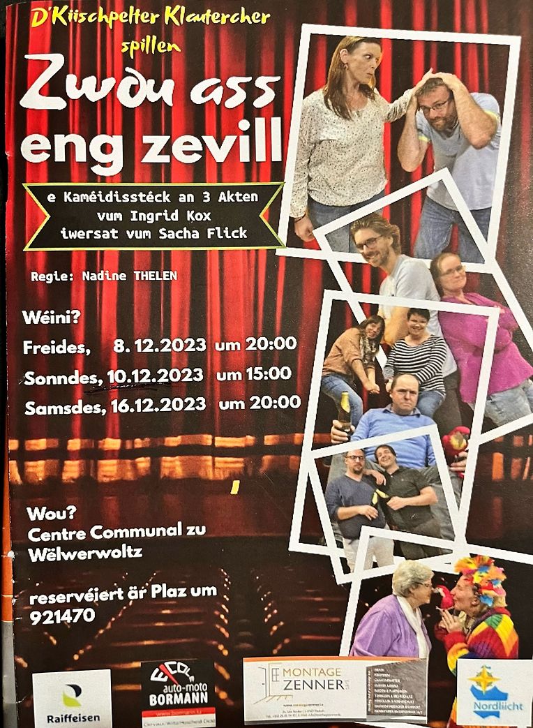 Wilwerwiltz D’Kiischpelter Klautercher spillen zwou as eng zevill Pol Sassel 7 Picture Gallery Please scroll down,to see more pictures. Published on Sunday, 10 December, 2023 at 22:54 Wilwerwiltz Kiischpelt, Luxemburg É wonnerschéint Kaméidisstéck an 3 Akten gespillt von de Kiischpelter Klautercher. Do lacht et sech Tréinen! Report inappropriate content More news by Pol Sassel > Am Bierig 19/12/25 Oberwampach Am schéinen Daal von der Wemperbaach 18/12/25 Schimpach Von Nidderwampech bis op belsch Grenz bei Briecht. 18/12/25 Wincrange Um Weiher am Dezember 17/12/25 Erpeldange (Eschweiler) Unser kleiner Haustierzoo 17/12/25 Erpeldange (Eschweiler)