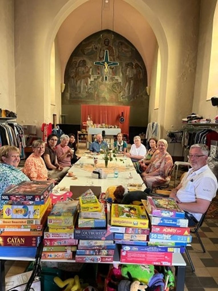 Après ce bon repas et un café, nous avons pris la direction d’Ernster ou nous avons fait la découverte d’un superbe projet : un vestiaire de seconde main dans une église désacralisée tenu par une équipe de supers bénévoles très investis. Leur choix de vêtements est large et vous trouverez aussi des chaussures , de la vaisselle, des bijoux et même du petit électro ménager. Marie-Christine et Franck nous ont rejoint là-bas. Après la visite des lieux nous avons pu bavarder et partager nos expériences autour d’une glace ou d’un morceau de tarte. Vers 17 heures, nous avons repris le chemin du retour avec des idées plein la tête et de belles expériences partagées.