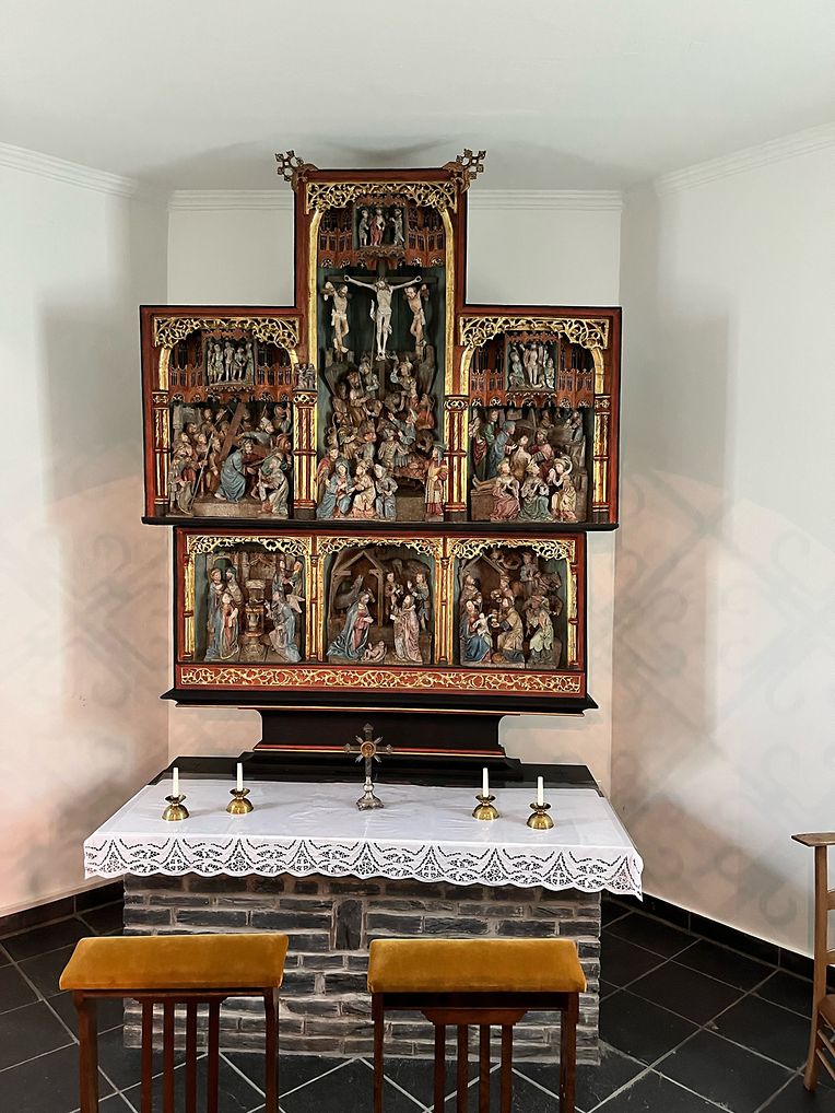 Der geschnitzte Altarschirm, der heute in der barocken Pfarrkirche von Hachiville ausgestellt ist, gilt als einer der wertvollsten Kunstschätze Luxemburgs.Das Stück aus dem 16. Jahrhundert, das ursprünglich in der Kapelle der Einsiedelei außerhalb des Dorfes untergebracht war, stellt Szenen aus dem Leben und der Passion Christi dar. Die Einsiedelei Die als eigenständiger Wallfahrtsort verehrte Helzer-Klaus-Kapelle enthält heute eine Gipskopie dieses Originalaltars.1973 gab Luxemburg eine Briefmarkenserie mit religiösen Bildern auf der Grundlage dieses Altars heraus. Einige Jahre später, im August 1976, wurde das Altarbild gestohlen. Glücklicherweise wurde es etwas mehr als einen Monat später gefunden, verpackt und bereit für den Versand ins Ausland.Das Rätsel, wer das Verbrechen geplant hat, bleibt.