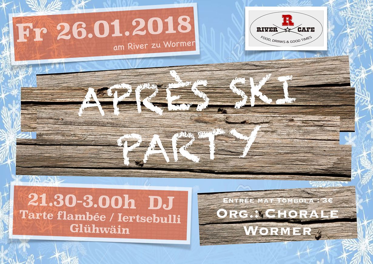 De Wormer Gesank invitéiert ganz häerzlech op seng Après-Ski Party e Freideg, 26. Januar an de River Café op Wormer. Vun 21h30 bis 3h00 ass mat flotter Musek fir Après-Ski Stëmmung gesuergt. Am Café kritt dir déi gewinnte Sachen z'iessen an ze drénken an am Zelt zerwéiert de Gesank iech Flames, Ietsebulli an e gudde Patt Glühwäin. Den Entrée kascht 3 € (Entréesbilljee mat Tombola).