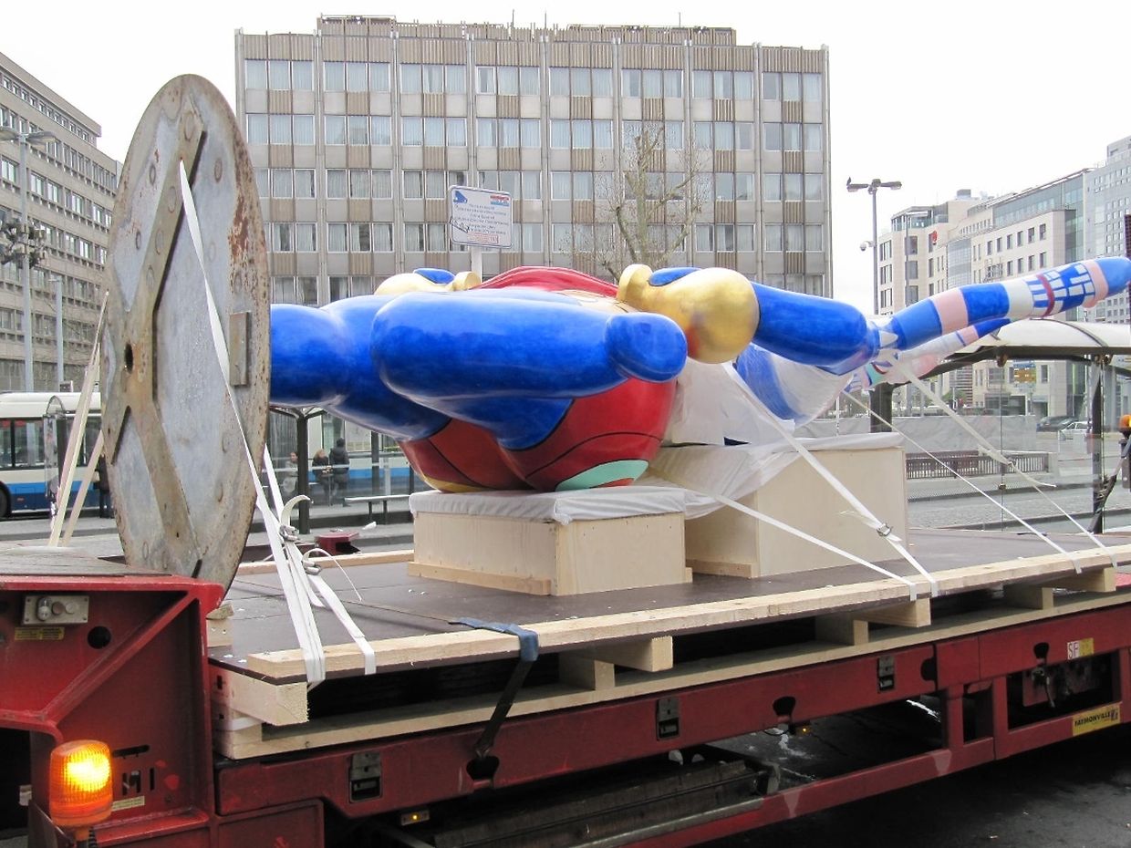Die Skulptur „La grande Tempérance“ von Niki de Saint Phalle wurde am Morgen des 8. Dezember mittels eines Schwerlastkrans von ihrem Betonsockel gehoben.
