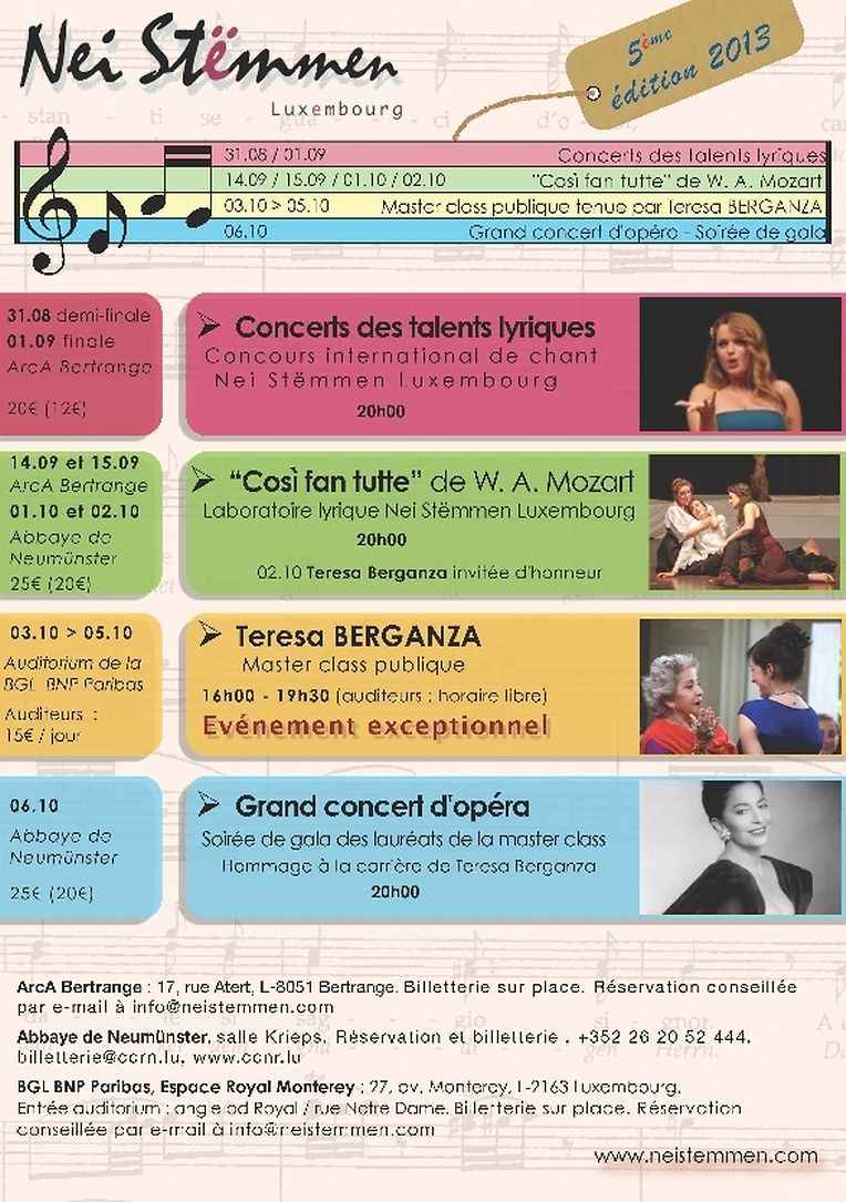 - le vendredi 6 octobre 2013 à 20h00 (Salle Krieps, Abbaye de Neumünster, Luxembourg) lors du « Grand concert d’opéra – Soirée de gala » en hommage à la carrière de l’artiste qui clôturera cette master class et la 5ème édition Nei Stëmmen Luxembourg.