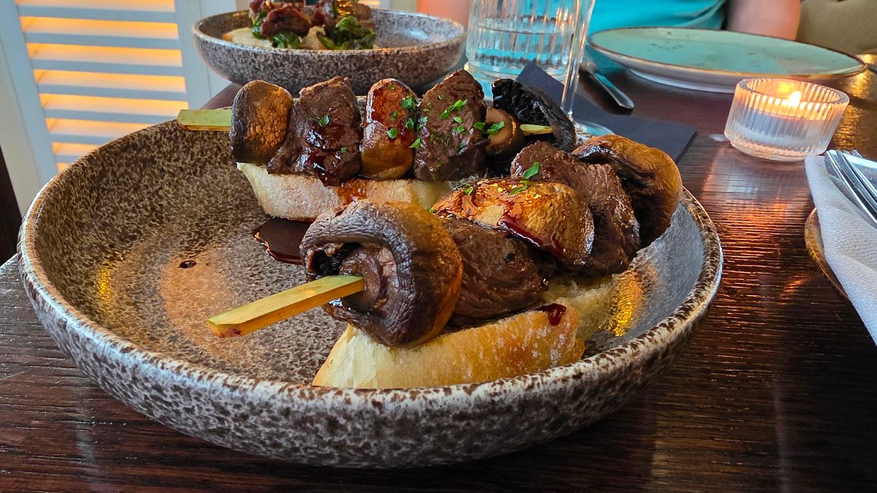 Nous avons commencé par partager deux types de brochettes. La première était une brochette de filet de bœuf servie avec des champignons. La viande était d’une tendreté fondante, parfaitement cuite, et les champignons ajoutaient une touche terreuse et beurrée qui la complétait bien. La seconde était une brochette de pluma de porc ibérique, accompagnée de poivrons de Padrón. C’était un vrai régal – du porc juteux et savoureux et ces poivrons légèrement cloqués, certains doux et d’autres avec un piquant surprenant. Une combinaison ludique et délicieuse.