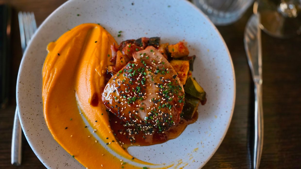 Mon compagnon de table a choisi le steak de thon grillé, servi avec une purée de patates douces et des légumes. Le thon était saisi à la perfection – croustillant à l’extérieur, magnifiquement rosé à l’intérieur – et plein de saveur. La purée de patates douces ajoutait une pointe de douceur naturelle qui se mariait parfaitement avec le poisson, créant un plat à la fois léger et satisfaisant.