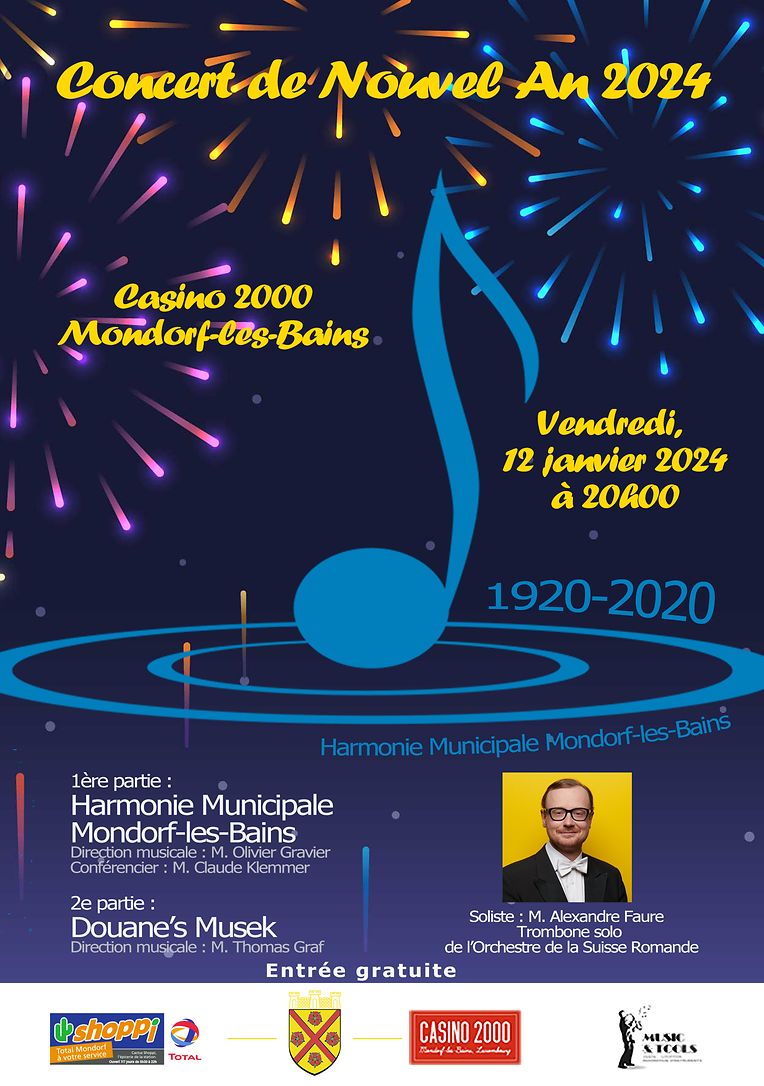 Rendez-vous incontournable au Casino 2000 de Mondorf-les-Bains le 12 janvier 2024 pour le Concert de Nouvel An. L’Harmonie Municipale Mondorf-les-Bains, sous la direction d’Olivier Gravier, jouera la première partie du concert, enrichie par la présence du tromboniste Alexandre Faure, soliste. Originaire de Metz, Alexandre Faure est lauréat de plusieurs concours internationaux (Toulon, Grenchen, Passau, Guebwiller) et il a joué en tant que premier trombone solo avec l’Orchestre des Jeunes de l’Union Européenne.