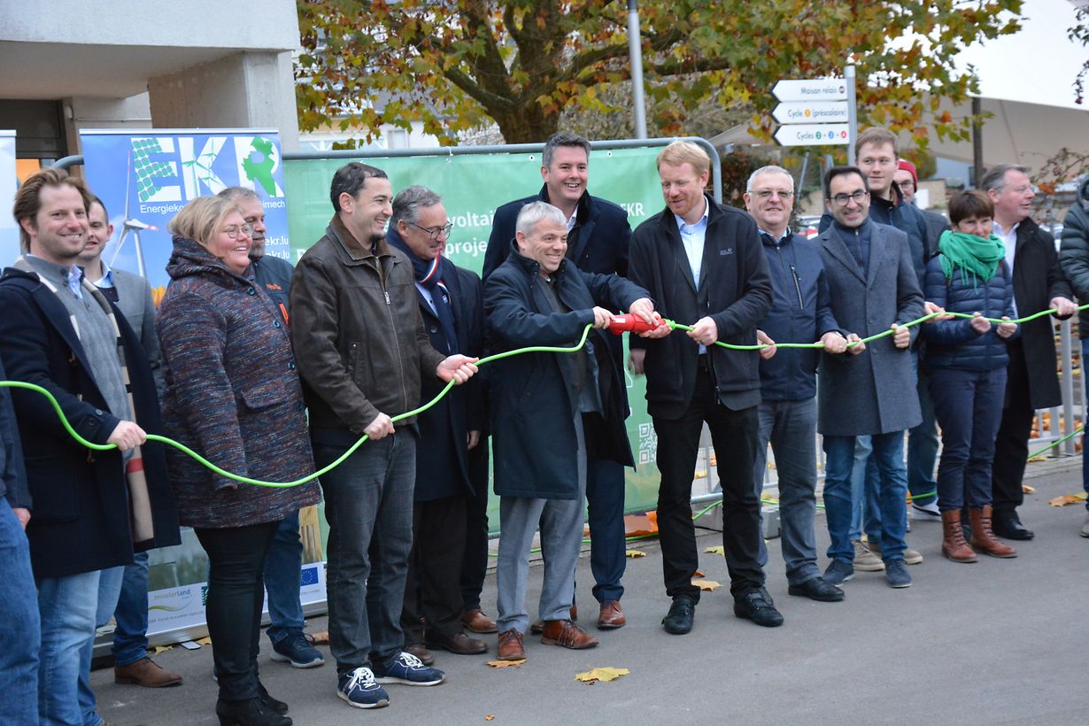 Mondorf. Anlässlich der Fertigstellung der zweiten PV-Anlage der im November 2022 gegründeten «Energiekooperative Kanton Remich (EKR)» fand kürzlich die offizielle Inbetriebnahme in Mondorf statt. Diese 68 kWp-Anlage wurde gemäß den EKR-Prinzipien auf dem Dach eines öffentlichen Gebäudes installiert, in diesem Fall auf dem Dach der Grundschule in Mondorf. Die während der Sommerferien geplanten Dachisolierarbeiten boten sich für den Aufbau der Unterkonstruktion für die 160 Module à 425 W an. Nach dem Anschluss an die Trafostation am 9. November und an das öffentliche Stromnetz am 11. November folgte am darauffolgenden Tag die offizielle Einweihung.