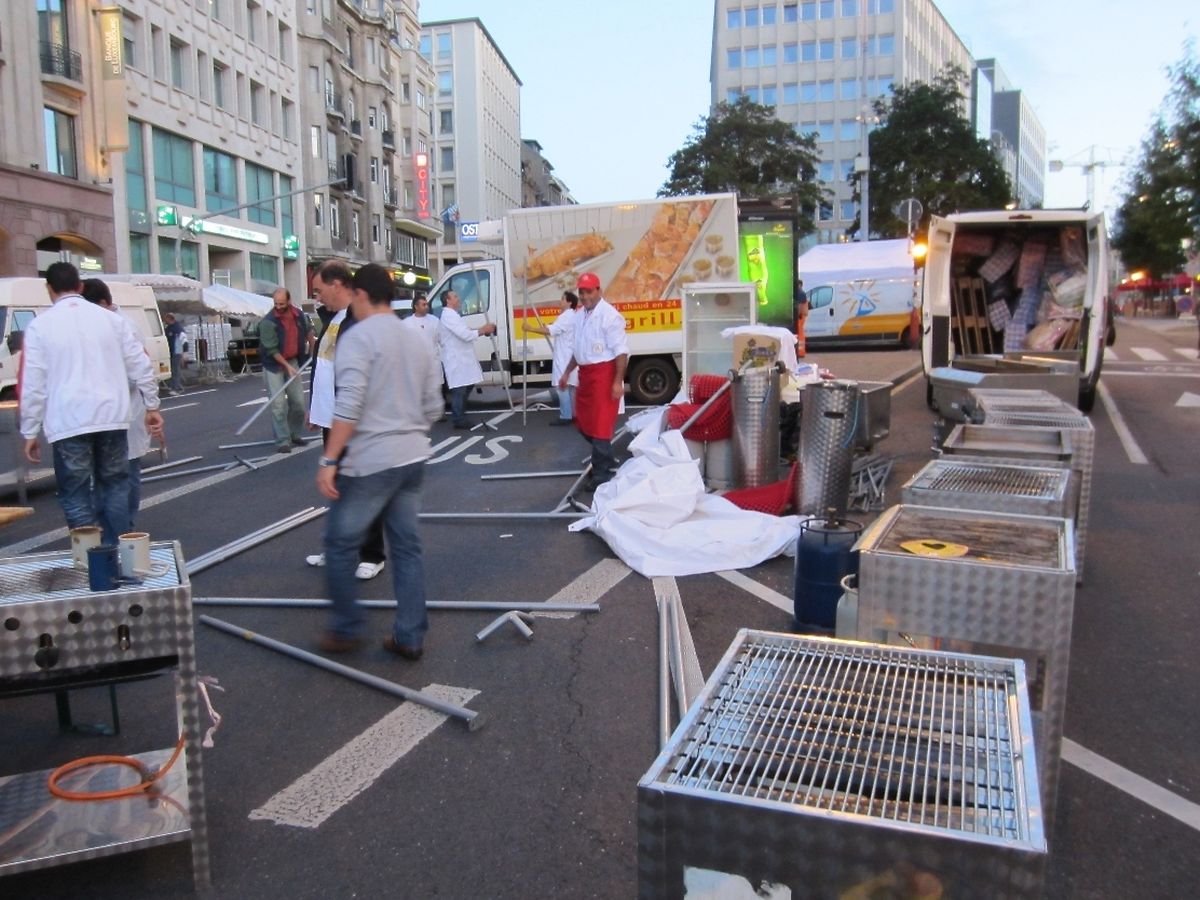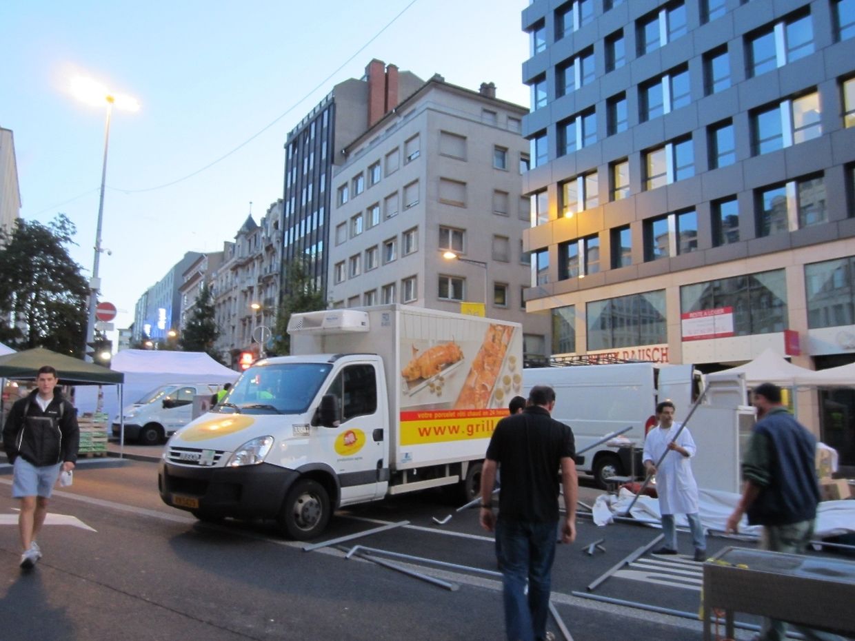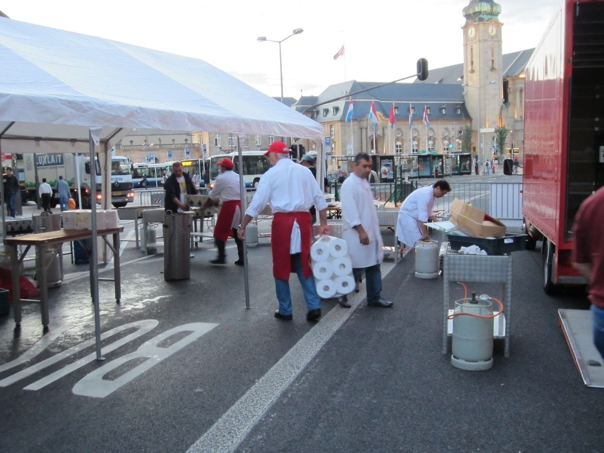 Nomen est Omen: Wer den Domainnamen www.grill.lu im Internet führt, muss wohl in Luxemburg auch die Nummer Eins im Grillen, Brutzeln und Schmoren sein... Bei der Braderie 2011 jedenfalls hat die Firma, die sich im Web hinter www.grill.lu versteckt, die wohl größte Grillmeile errichtet, und das auch noch an strategisch günstiger Stelle. Dort nämlich, wo sich Aal und Nei Avenue trennen, gleich am Anfang der verkehrsfreien Einkaufszone gegenüber des Bahnhofs, steht dieser Grillstand. Noch vor Sonnenaufgang wurde an diesem Braderietag 2011 der Imbiss-Stand errichtet. Denn ab 7 Uhr sollen die ersten Grillinger und andere Bratwürste hier schmoren, ab Vormittag dann andere Schweinereien, die Spezialität des Hauses. Erste Bildeindrücke vom Aufrichten dieses Grillstandes.