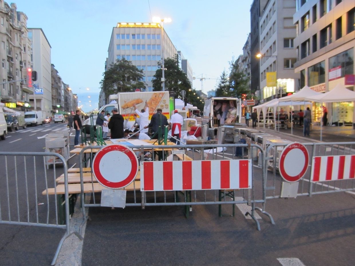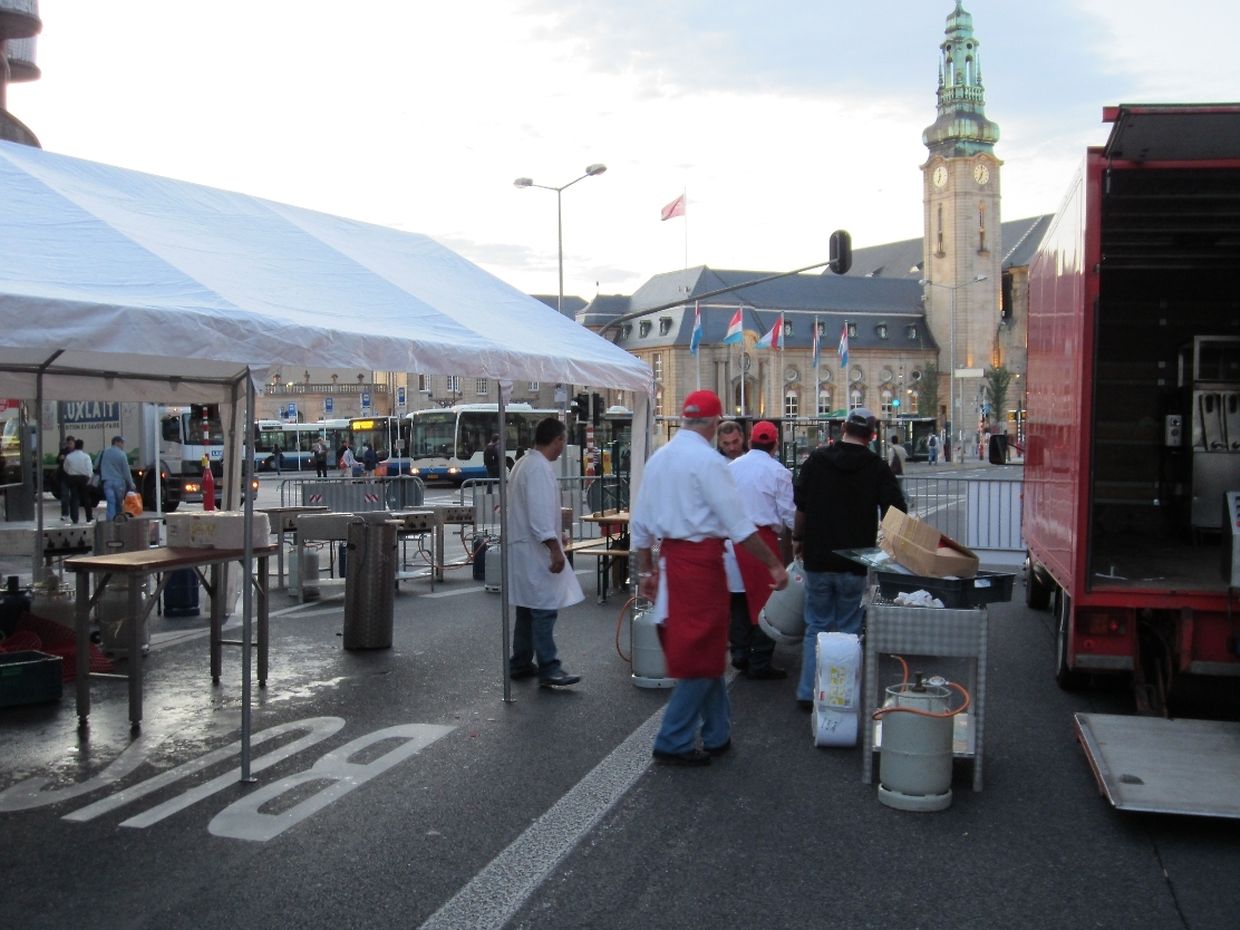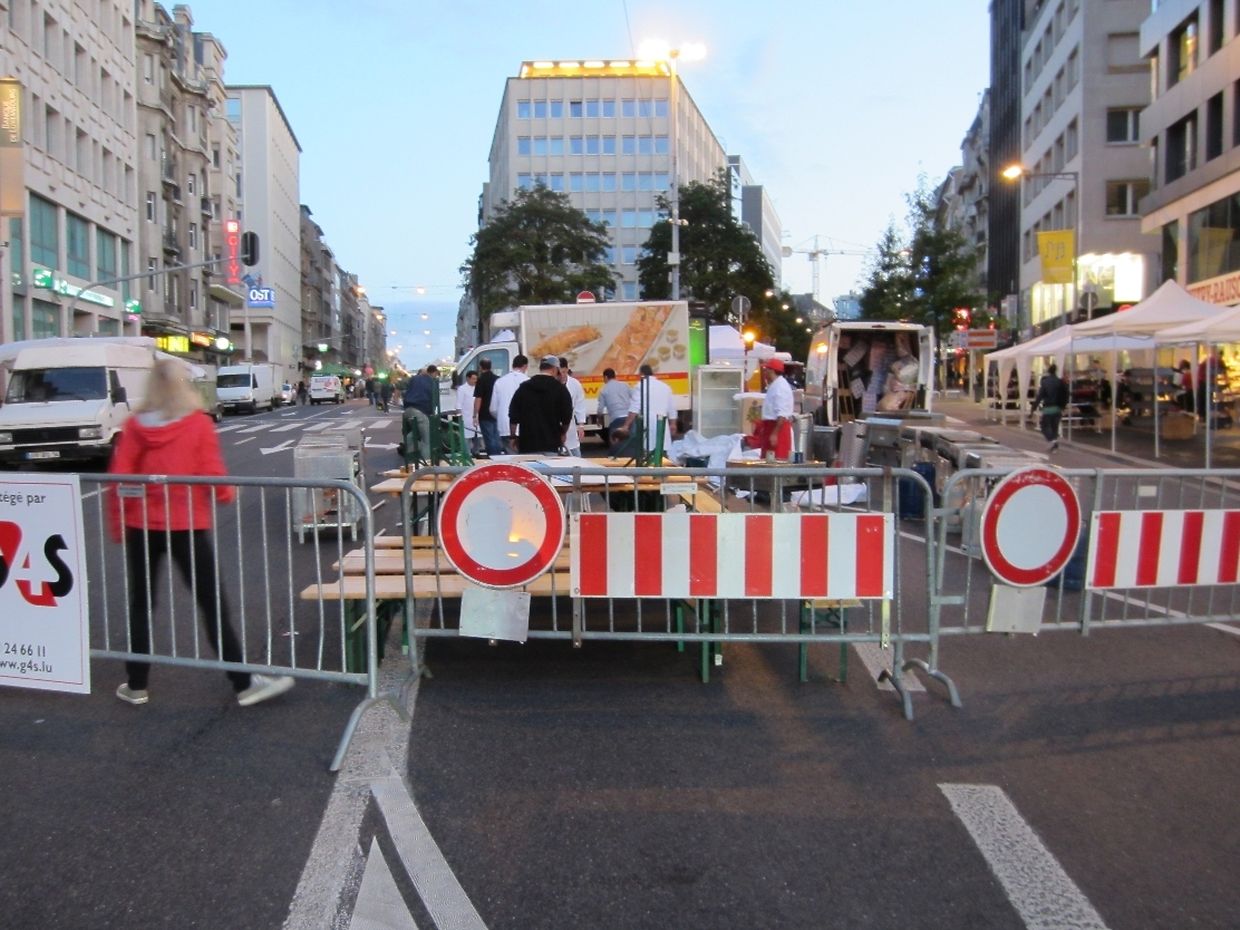 Nomen est Omen: Wer den Domainnamen www.grill.lu im Internet führt, muss wohl in Luxemburg auch die Nummer Eins im Grillen, Brutzeln und Schmoren sein... Bei der Braderie 2011 jedenfalls hat die Firma, die sich im Web hinter www.grill.lu versteckt, die wohl größte Grillmeile errichtet, und das auch noch an strategisch günstiger Stelle. Dort nämlich, wo sich Aal und Nei Avenue trennen, gleich am Anfang der verkehrsfreien Einkaufszone gegenüber des Bahnhofs, steht dieser Grillstand. Noch vor Sonnenaufgang wurde an diesem Braderietag 2011 der Imbiss-Stand errichtet. Denn ab 7 Uhr sollen die ersten Grillinger und andere Bratwürste hier schmoren, ab Vormittag dann andere Schweinereien, die Spezialität des Hauses. Erste Bildeindrücke vom Aufrichten dieses Grillstandes.