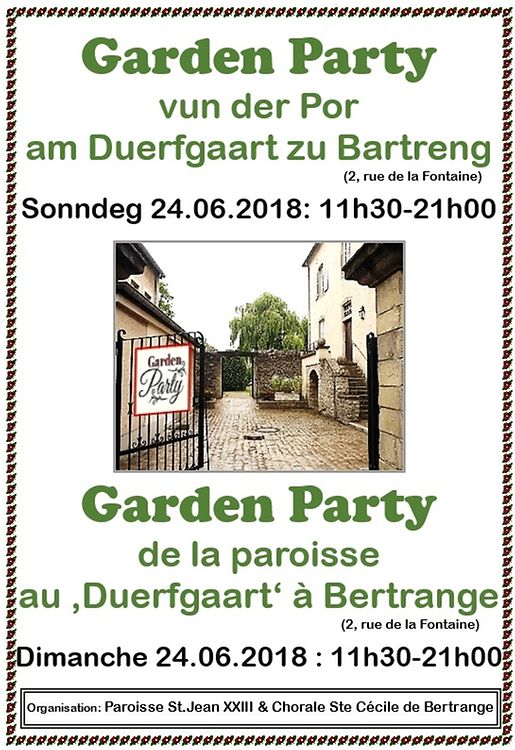 Am Duerfgaart zu Bartreng ass vun 11h30 bis 21h00 eng Garden Party. Si ass organiséiert vun der Por St. Jean XXIII a vun der Chorale Ste Cécile. Fir Kanner a Jugendlech gëtt et Spiller, fir déi Erwuessen eng grouss Tombola a fir jidderee genug z'iessen an ze drénken.