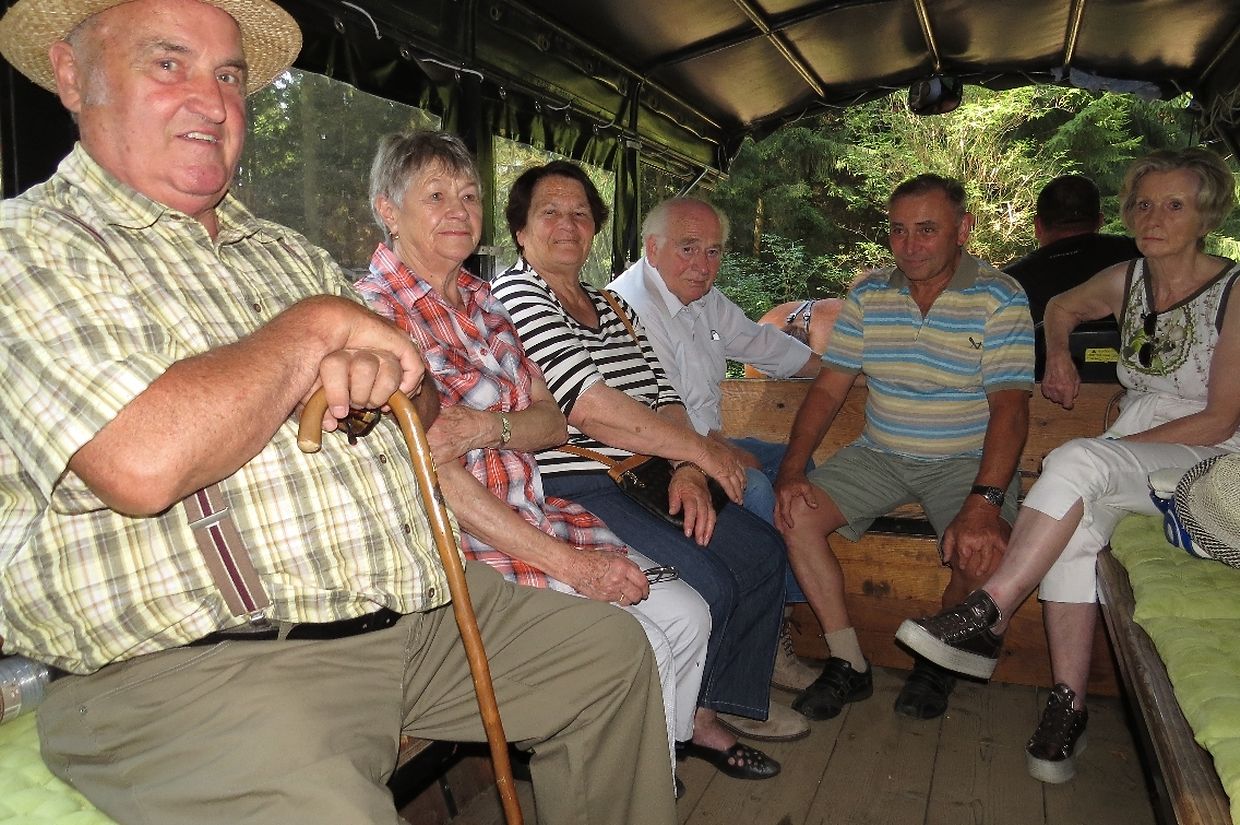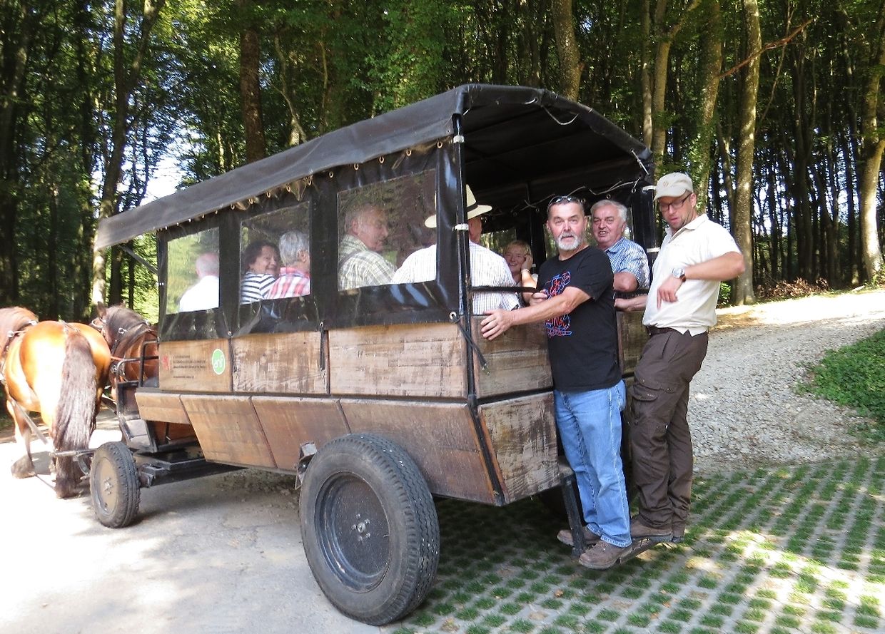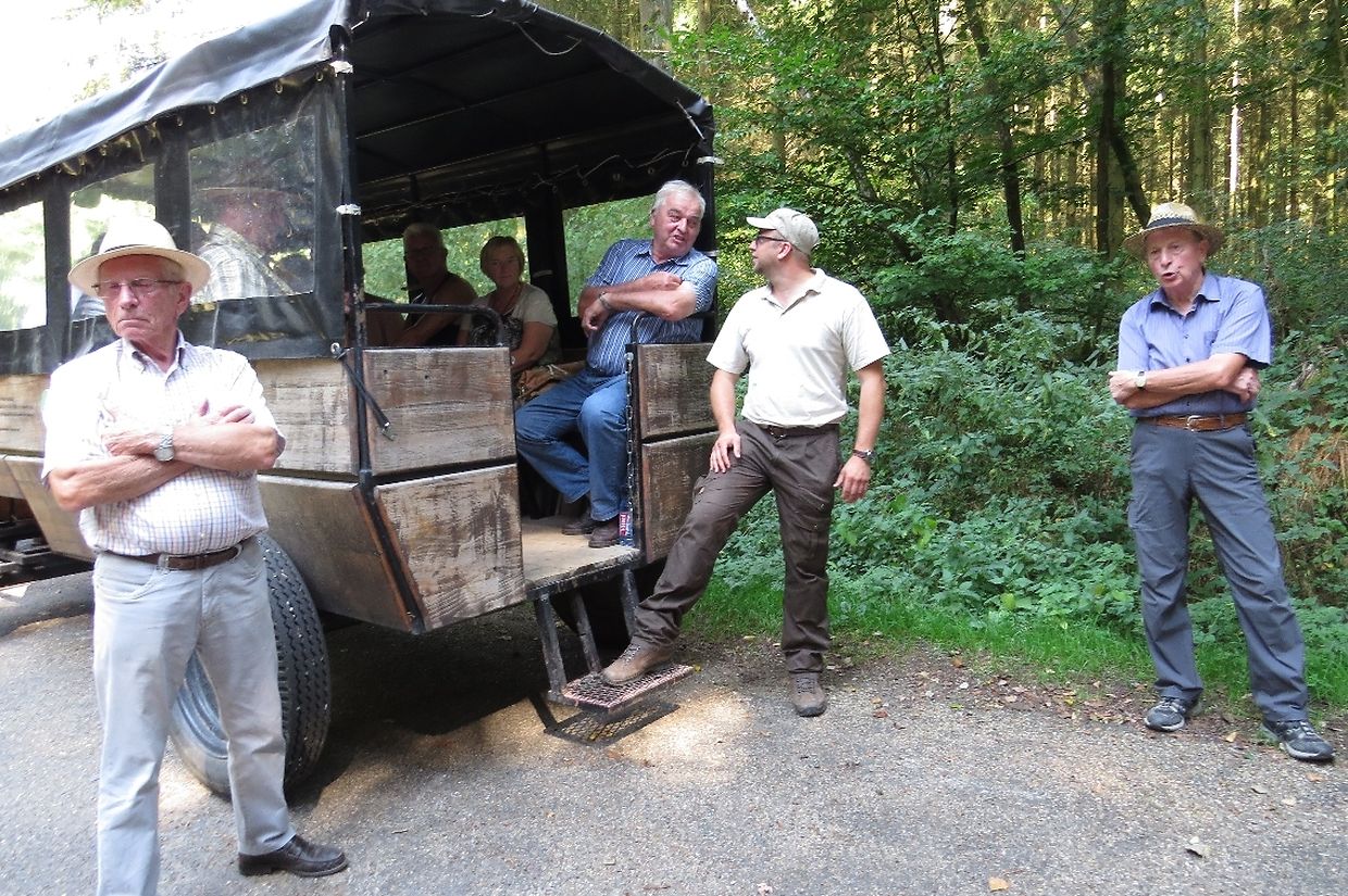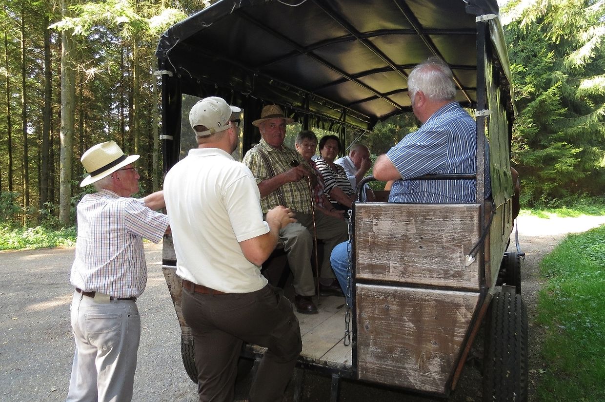 Der ihnen bekannte, sympathische und freundliche Gemeindeförster, welcher hier seine Arbeitsstelle bezogen hat, erklärte sich spontan bereit die angereisten, rüstigen Einwohner durch sein Waldgebiet zu führen. Nach dem Besuch des Forsthauses, in welchem die Forststelle eingerichtet ist, bestieg die lebensfrohe Gruppe einen, von Pferden gezogenen Leiterwagen; die Rundfahrt durch die Forsten konnte beginnen. Interessiert verfolgten sie die fachmännischen Erklärungen des Gemeindeförsters David FARINON, sie zeigten sich erstaunt, was sie alles hier erfuhren und erklärt bekamen.