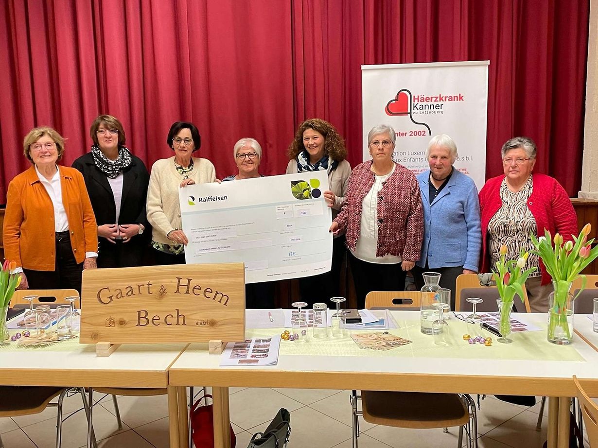 Am Kader vun der Generalversammlung vum Gaart an Heem Bech, déi de 27. Februar stattfonnt huet, ass e Scheck vun 1.500 Euro un d’Associatioun Häerzkrank Kanner Lëtzebuerg iwwerreecht ginn. Dëse Betrag setzt sech aus dem Erléis vum Hierschtfest, dat am Oktober 2025 organiséiert gouf, souwéi aus der Niklosfeier, déi all Joër vun der Gemeng Bech op d’Bee gestallt gëtt, zesummen. Doriwwer eraus huet den Pier Johanns 150€ aus engem Foto-Virtrag iwwer seng Vëlosrees op Santiago de Compostela bei den Don bäigesteiert.
