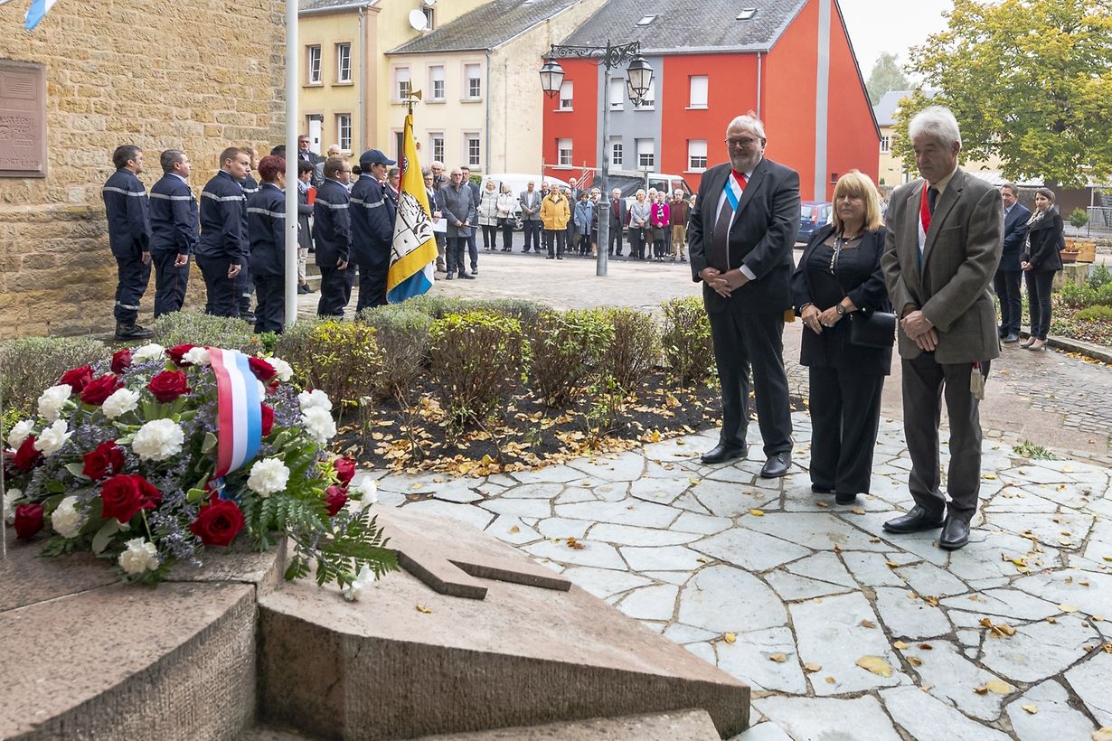 Uschléissend hunn de Buergermeeschter Camille Hoffmann, de Schäffen Emile Wies an d’Andreza Sanguessuga (Gemengerot) eng Gerbe beim “Monument aux Morts” néiergeluecht. Zum Ofschloss hunn d’Chorale Sainte Cécile Beefort a Sang mat Waldbëlleg/Haler d’Heemecht gesongen.