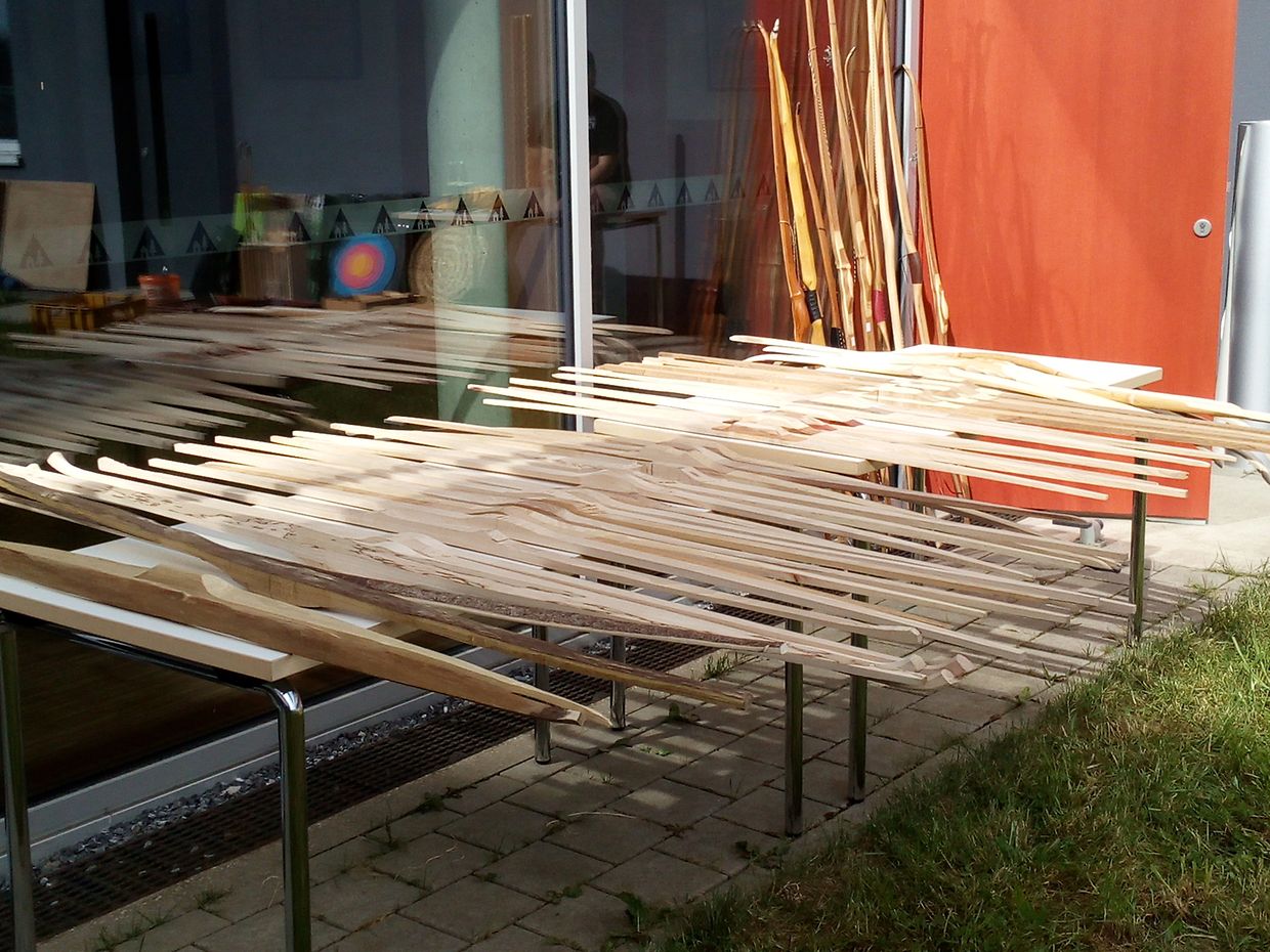 Der Workshop startete mit einer spannenden kurzen Einführung in die Geschichte der unterschiedlichen Bögen und ihrer Verwendung. Den Teilnehmer standen zahlreiche Bogenrohlinge aus einheimischem Hölzern wie Esche und Robinie, aber auch Hickory zur Verfügung. Nun galt es sich für ein Bogenmodell nach historischen überlieferten Vorlagen zu entscheiden.