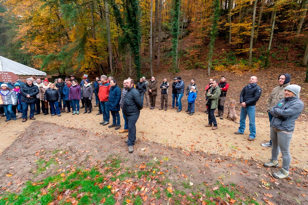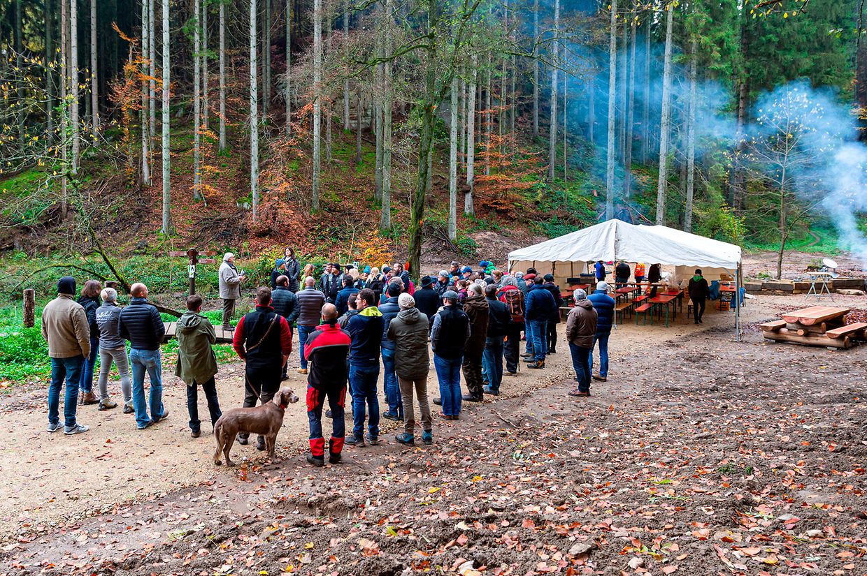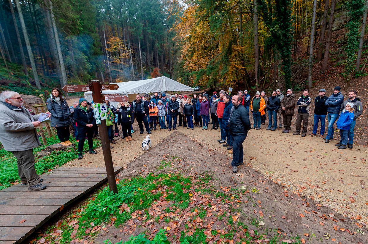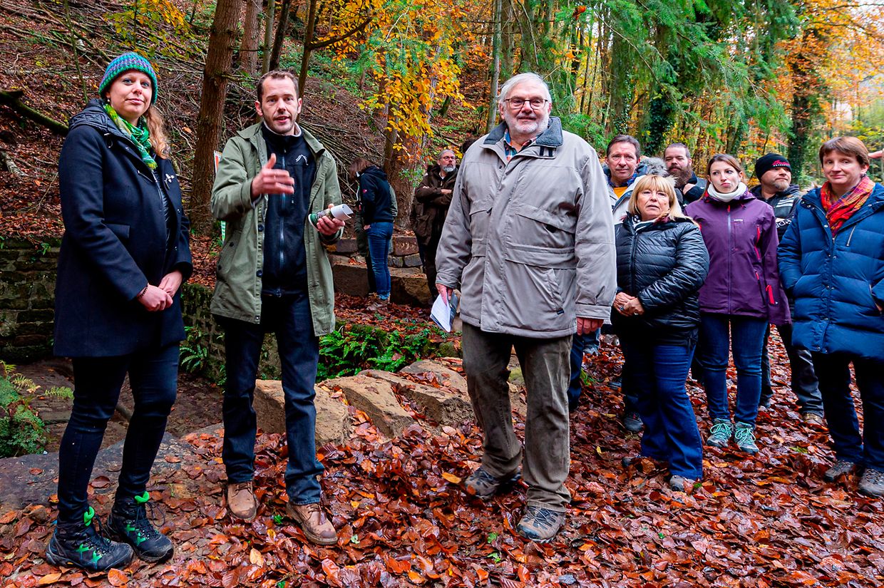 De Rendezvous war um Parking beim Schlass. Nodeems een e bëssche laanscht d’Schlass an duerch de Bësch getrëppelt ass huet de Buergermeeschter Camille Hoffmann zum Schluss vum virun zwee Joer ageweite Holzsteg d’Éieregäscht begréisst, dorënner och d’Ëmweltministesch Carole Dieschbourg. Um Wee bei de Klingelbuer konnt een am Dall d’Fiichtegkeet gutt spieren a genau dës Fiichtegkeet bitt dem Bam vum Joer 2019, der Flatterulm, ideal Bedingungen un. Hei am Dall leeft och d’Haupeschbaach an dréit soumat ee groussen Deel zu der Fiichtegkeet op dëser Plaz bäi.