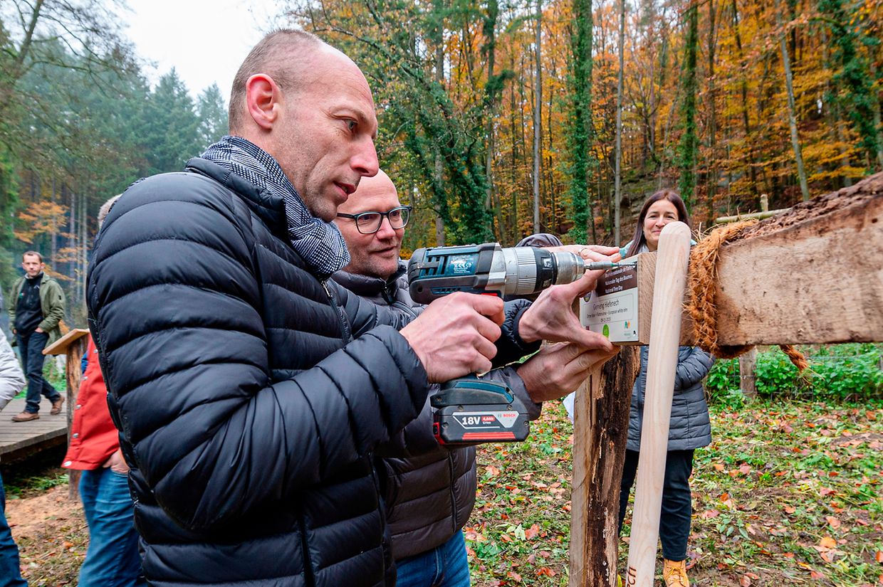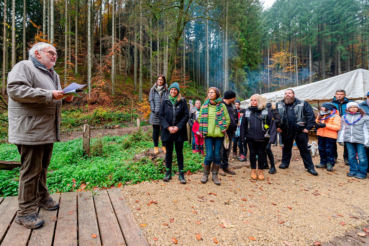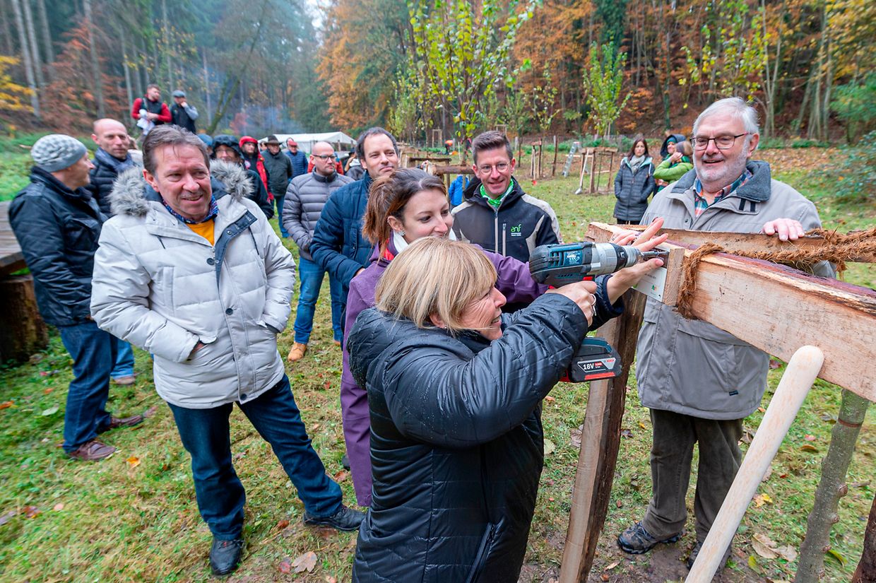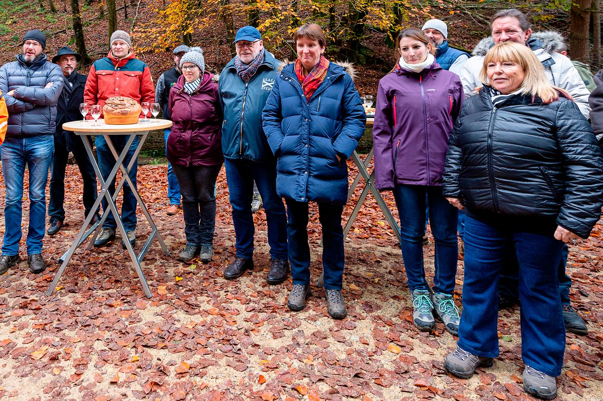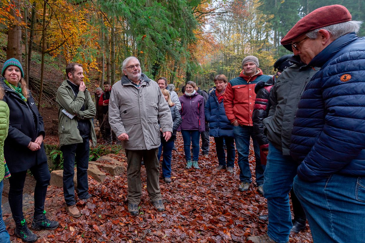 De Rendezvous war um Parking beim Schlass. Nodeems een e bëssche laanscht d’Schlass an duerch de Bësch getrëppelt ass huet de Buergermeeschter Camille Hoffmann zum Schluss vum virun zwee Joer ageweite Holzsteg d’Éieregäscht begréisst, dorënner och d’Ëmweltministesch Carole Dieschbourg. Um Wee bei de Klingelbuer konnt een am Dall d’Fiichtegkeet gutt spieren a genau dës Fiichtegkeet bitt dem Bam vum Joer 2019, der Flatterulm, ideal Bedingungen un. Hei am Dall leeft och d’Haupeschbaach an dréit soumat ee groussen Deel zu der Fiichtegkeet op dëser Plaz bäi.