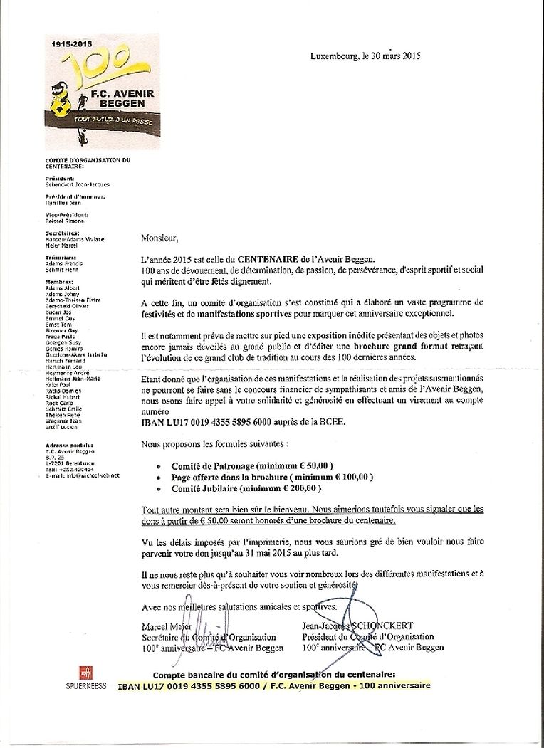 WILLST DU AUCH DIE 100-JAHR-FEIER DES FC AVENIR BEGGEN UNTERSTÜTZEN?