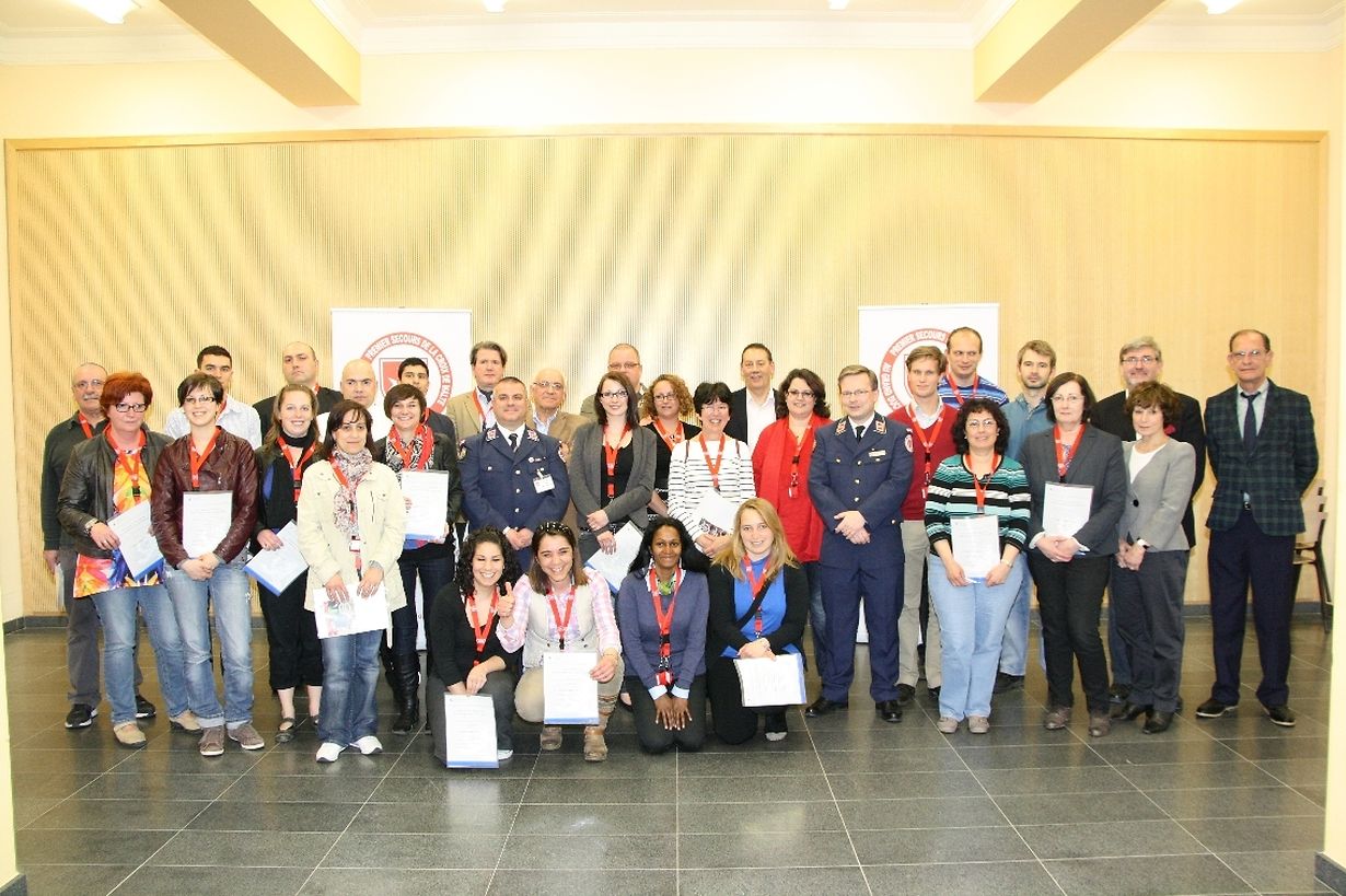 Feyder gratulierte den Teilnehmern Aurélie Adam, Jonathan André, Sandrine Bettoni, Mira Sonia Crespo, Carmelo Ciccariello, Nicolas Chahmérian, Lionel Coupe de Saint Donat-Pourrieres, Wladimir de Kéchilava, Eric Deudon, Nandita Derleyn, Pascal Di Tullo, Teresa Fernandes Ministro, Jean Pierre Genicot, Guiseppe Giannetto, Yves Hourin, Monique Lamborelle-Theis, Giovanna Losito De Tommaso, Rusnak Lubos, Dominique Macieri, Lilly Medernach, Alice Nobre Benvindo, Julie Probst, Stéphie Pereira Marques, Monica Isabel Santana Baptista, Jan Sedlacek, Annik Thiry Blanchaert, Maria Jose Vieira Esteves und Audres Wilket. „Jemanden in einer Notlage helfen ist gesetzlich verankert und kann bei nicht Befolgung bestraft werden. Hie und da genügt es die europäische Einheitsnummer 112 zu wählen, um Hilfe anzufordern.