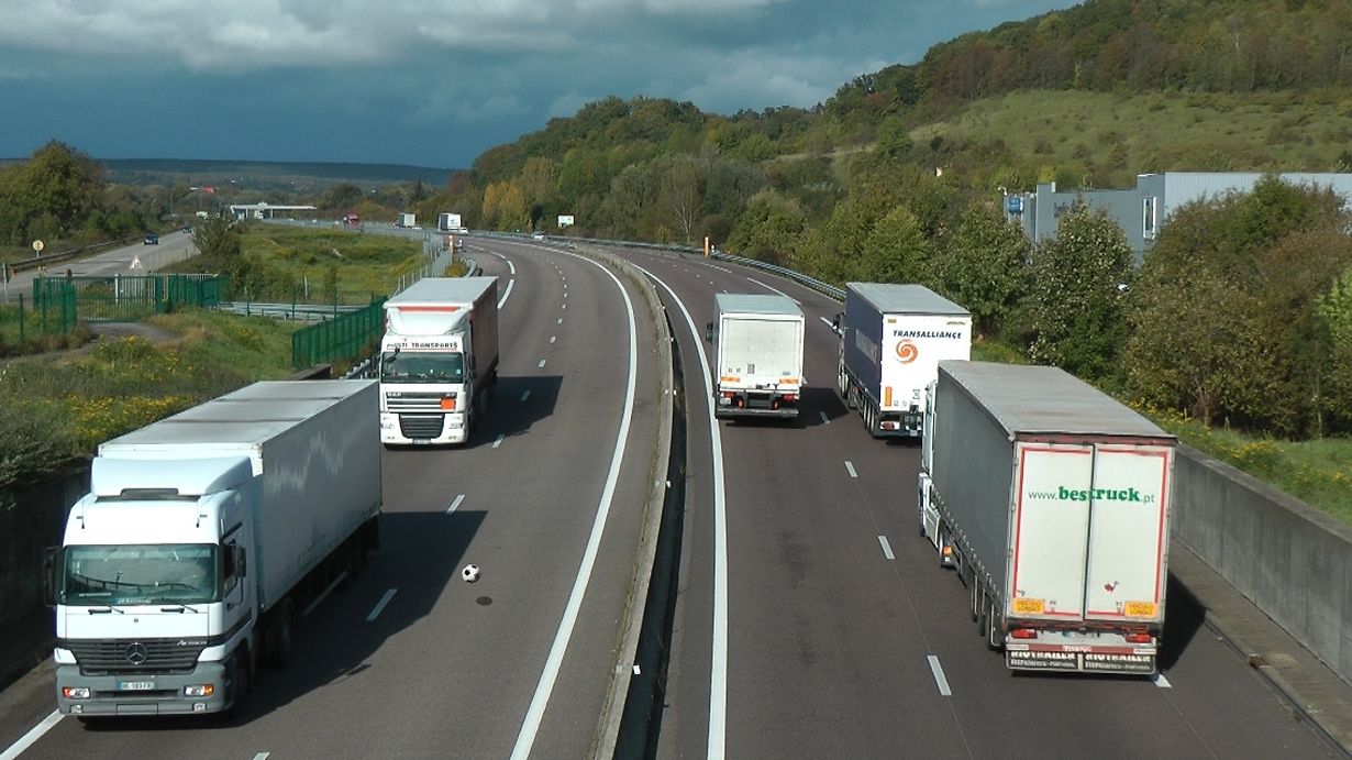 In TRUCKS setzt Nicolas TOURTE auf jede Seite einer Leitplanke auf der Autobahn zwei Lastwagen, die sich einen Fussball hin- und herschiessen, wie in den Videospielen der 1980er Jahren, die ein