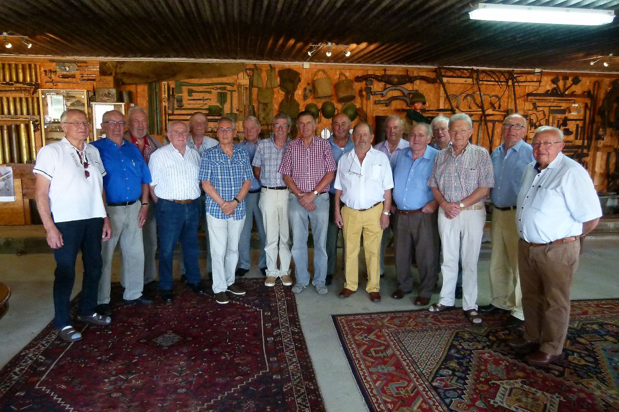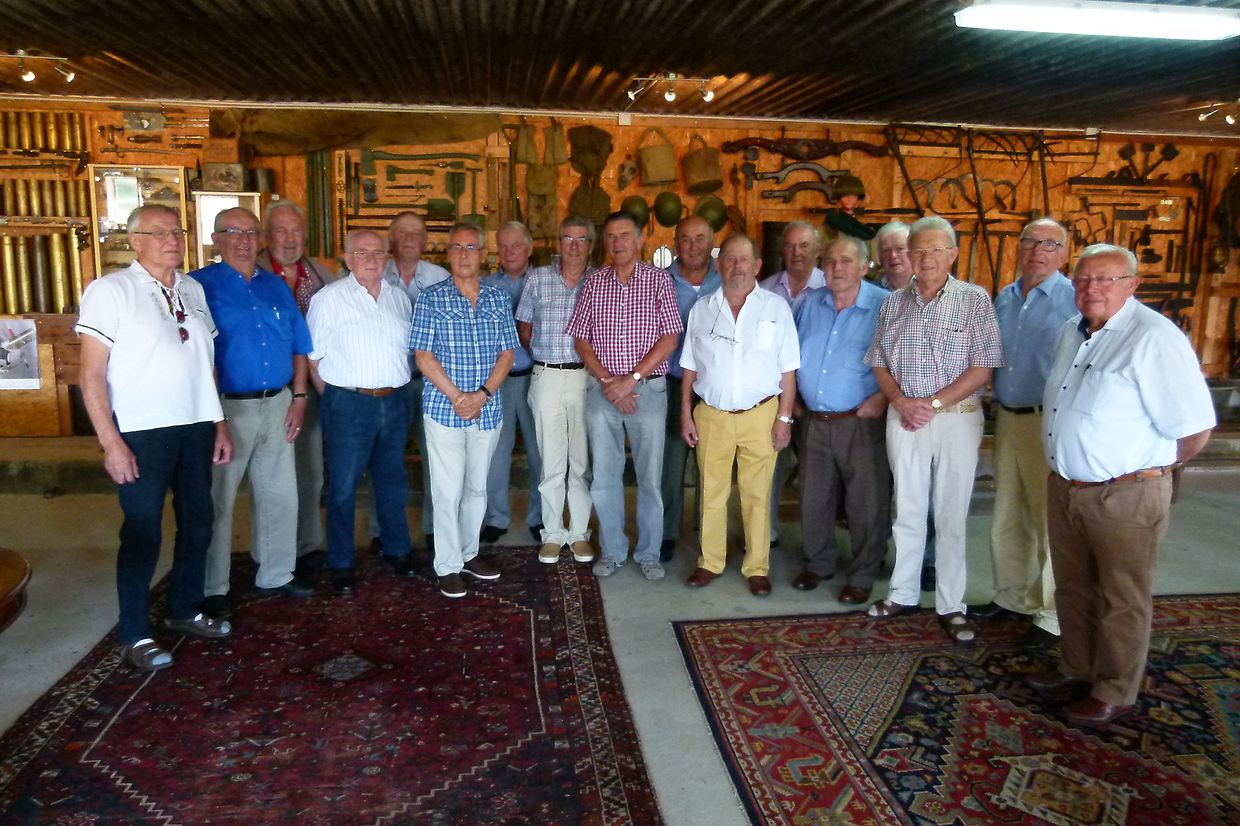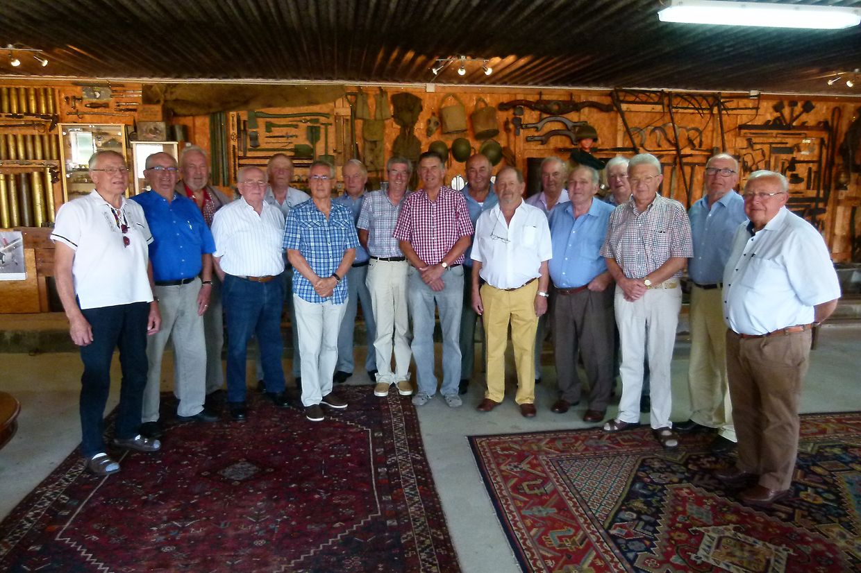 Kürzlich trafen sich 17 Kollegen, die während der Schuljahre 1954 bis 1956 die Ackerbauschule in Ettelbrück besuchten. Sie trafen sich in der fein hergerichteten Scheune ihres Kollegen Loll Wirtz in Berbourg, wo der Besitzer auch seine Sammlerleidenschaft unter Beweis stellte. Tausende vun Stücken – alle in sauberem und einwandfreiem Zustand – aus Haushalt, Landwirtschft aber auch aus dem Zweiten Weltkrieg schmücken die Wände dieses Raumes. Der Sekretär des Freundeskreises, Feess Ketter, hatte – wie schon seit Jahren – auch diesmal auf eine mustergültige Art und Weise für die Einladungen und Einschreibungen Sorge getragen, Den Apéritif boten Loll Wirtz und Arthur Neyens an, das Mittagessen wurde von einem bekannten Restaurant angeliefert und aufgetragen. Während des Essens machten manche Anekdoten aus der Schulzeit die Runde ; eines der Hauptthemen waren aber die Sorgen in der Landwirtschaft, die durch die große Hitze, die im Augenblick herrscht, nicht kleiner werden.