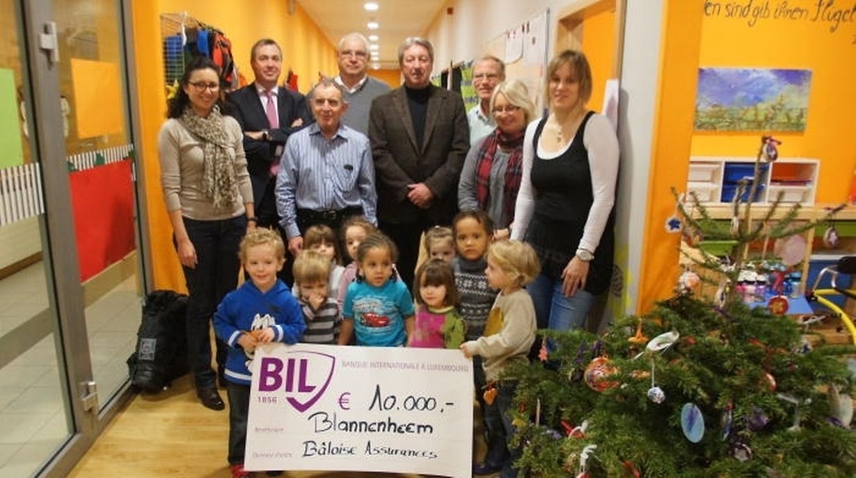 In Form eines Schecks überreichten Bâloise-Generaldirektor Romain Braas und Laurence Fransen, Verantwortliche der „Ressources humaines“, dieser Tage die Spende in Höhe von 10 000 Euro symbolisch an die Schulkinder sowie an den Direktor des Blindenheims, Roger Hoffmann. Dies war der Erlös des Weihnachtsmarkts mit dem Verkauf von Gebäck und Getränken sowie vom Essen mit den Familien der Beamten und Agenten. (TEXT/FOTO: JOS CLEES)