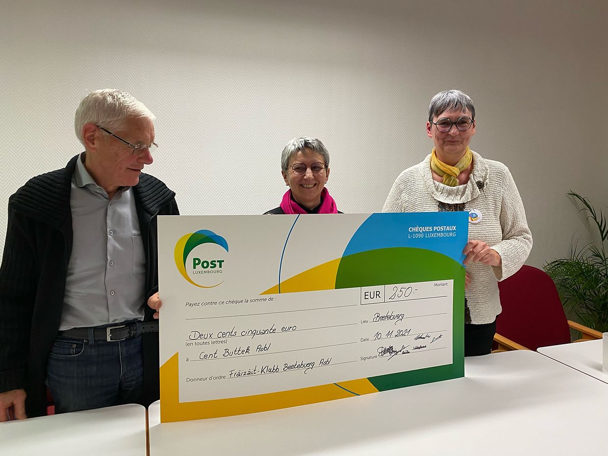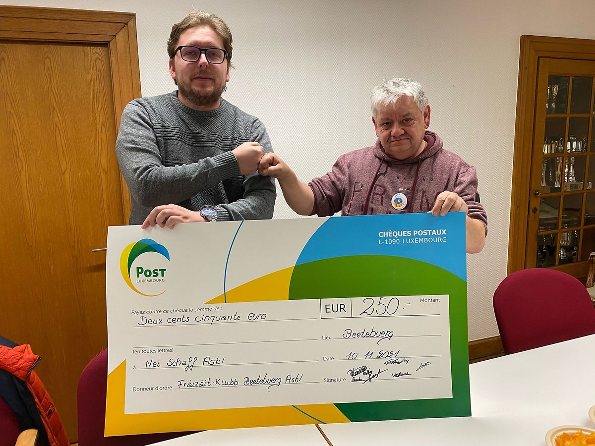 Den 10.11.2021 huet de Fräizäit-Klubb vu Beetebuerg zwou Associatiounen vu Beetebuerg een Don vu jeweils 250 Euro iwwerreecht fir hir wäertvoll Aarbecht zu ënnerstëtzen, dëst eng Kéier fir d Associatioun Eng Nei Schaff Asbl an den Cent Buttek vu Beetebuerg.