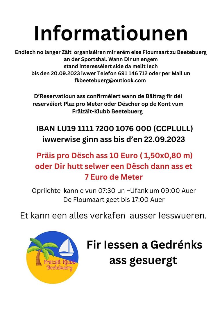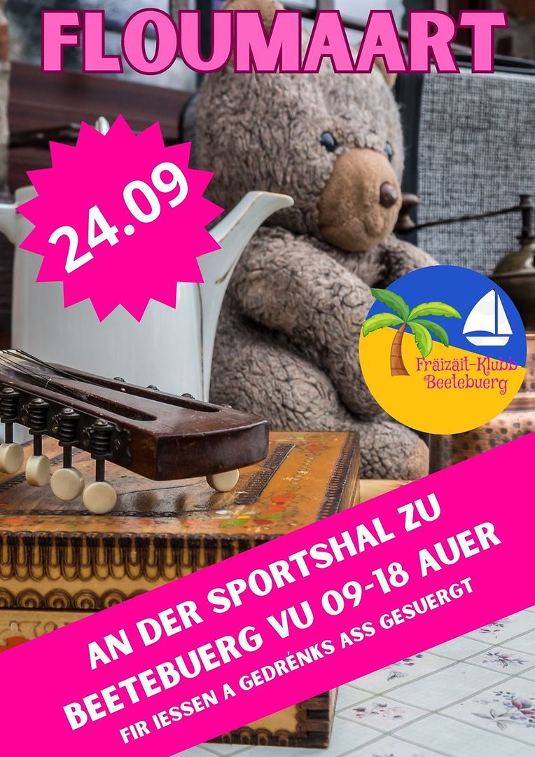 Bettembourg Floumaart zu Beetebuerg de 24.09.2023 an der Sportshal Fräizäit-Klubb Beetebuerg 2 Galerie d'images Faites défiler la page vers le bas pour voir plus d'images. Publié le dimanche 6 août 2023 à 10:53 Bettemburg, Luxemburg Grousse Floumaart an der Sportshal zu Beetebuerg, mellt Iech elo un wann Dir e Stand wëllt oder kommt de 24.09.2023 bis laanscht a maacht gutt Affären. All weider Informatiounen iwwer Email Fkbeetebuerg@outlook.com oder Tel. 691146712 Signaler contenu inapproprié Plus de nouvelles de Fräizäit-Klubb Beetebuerg > Ënnerstetzung vun zwou Associatiounen zu Beetebuerg 12/11/21 Bettembourg Flott Impressiounen vun eisem 1.Oldtimertreffen zu Beetebuerg den 14&15.09.2019 17/09/19 Bettembourg