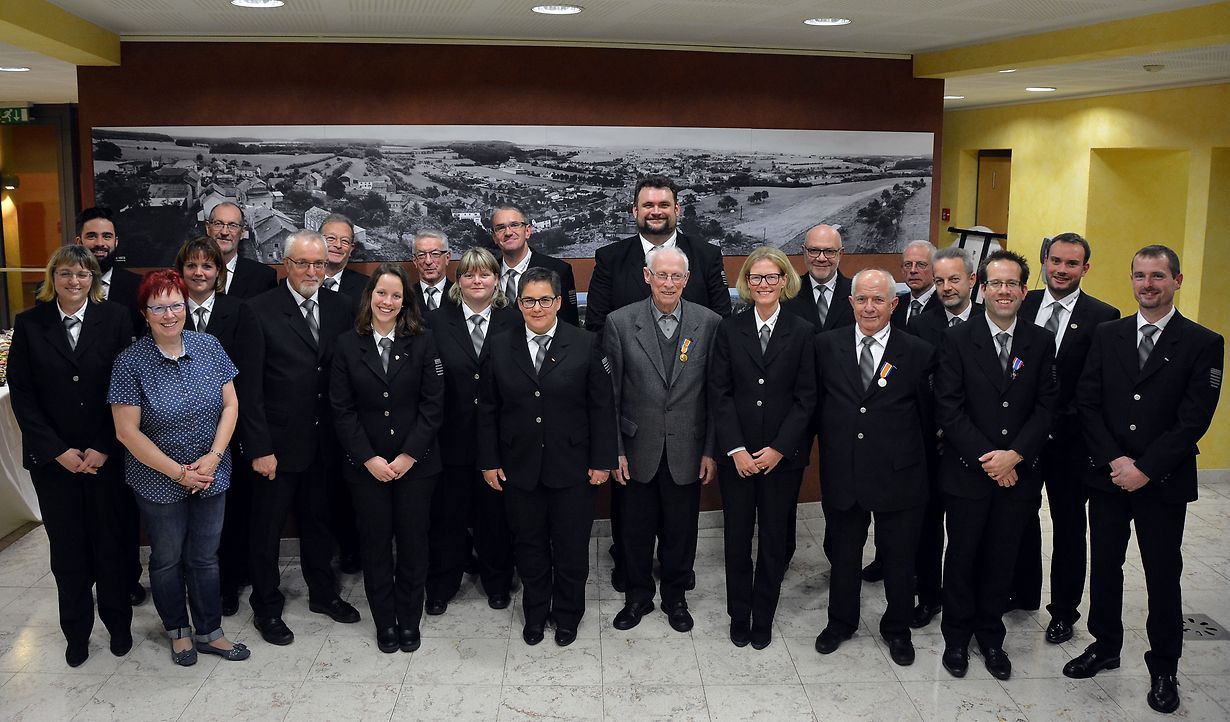 No der Mass war dat traditionellt Veräinsiessen, wou de President folgend Leit fir hier laangjäreg Memberschaft am Veräin konnt éieren: Médaille de mérite en bronze fir 10 Joer am Veräin un de Loïc Brune an de Georges Lucius, médaille de mérite en vermeil avec palmettes fir 40 Joer am Veräin un de Jeannot Ley an de Pol Schummer, médaille de mérite en argent Grand-Duc Adolphe fier 50 Joer am Veräin un de Jos Krieps, médaille de mérite en vermeil avec palmettes Grand-Duc Adolphe fir 70 Joer am Veräin un den Ernest Wendel, an d’croix de mérite en argent fir 10 Joer Tätegkeet als Sekretär, President a Vize-President un de Claude Schummer. Donieft goufen d’Sylvie Schmitz, d’Cathy Alen an de Pol Schummer fir hiren héije Prouwebesuch geéiert. De President Jacques Jacobs huet a senger Ried op ee beweegten Joer mat vill Aktivitéiten zréckgekuckt, an dem Dirigent Armand Meis souwéi deene Leit déi sech an iergendenger Manéier besonnesch engagéiert hunn, Merci gesot. Dëst waren d’Memberen vun den Organisatiounscomitéen Marche Gourmande a Broschür Gala-Concert, d’Archivaren Norbert Krack, Sylvie Schmitz a Carole Marnach, de Keessjee Marc Alen an d’Malou Reiser. (Foto: Jeannot Ley)