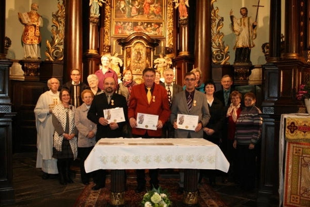 Das Fest der heiligen Cäcilia beging der vereinigte Chor Boegen-Lullingen-Stockem mit einem Gottesdienst in der Pfarrkirche von Boegen. Pfarrer Michel Bock würdigte die Verdienste der Chormitglieder, die stets zur Verfügung stehen, um die Gottesdienste gesanglich mitzugestalten. Er dankte der wackeren Sängerschar und händigte nach der Messe drei langjährigen Chormitgliedern den wohlverdienten Orden des Piusverbandes für ihre Treue zum Kirchenchor aus. 30 Jahre dabei ist Roby Pirretz, er konnte demnach die Goldmedaille in Empfang nehmen. Mit der Goldmedaille wurde ebenfalls Benoît Reitz für 30 Jahre im Kirchenchor geehrt. Die Goldmedaille mit Palmetten durfte Basty Differding entgegennehmen, er steht seit 40 Jahren im Dienst des Chores, er ist außerdem Organist und bei Bedarf auch Dirigent. Pfarrer Michel Bock beglückwünschte die Laureaten und wünschte ihnen, dass sie dem vereinigten Chor noch lange erhalten bleiben mögen.(Text/Foto: Nicole Milbert)