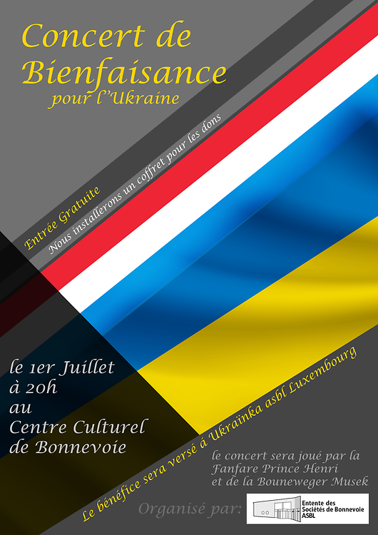 Dans ce malheureux et très difficile contexte, ensemble avec mon Comité, nous avons décidé d’organiser un Concert de bienfaisance au profit de l’association Ukraïna asbl. Notre concert de solidarité aura lieu le vendredi 1er juillet à 20 heures au Centre Culturel de Bonnevoie