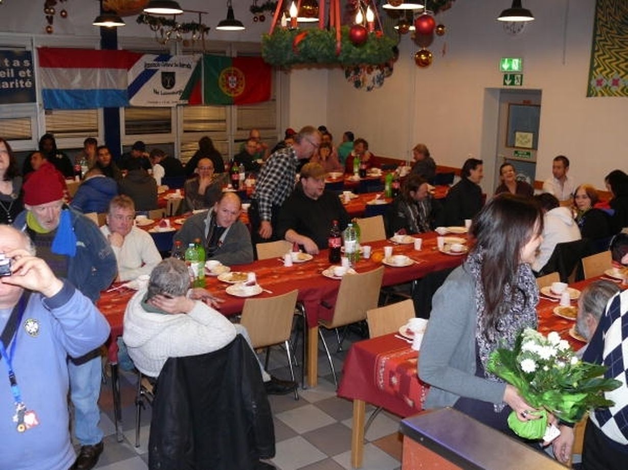 Das „Foyer Ulysse“ von „Caritas Accueil et Solidarité“ in Bonneweg lud am Samstag zusammen mit der „Association culturelle Beirado de Luxembourg“, die schon seit sechs Jahren eng zusammenarbeiten, zu ihrem alljährlichen Weihnachtsfest für Obdachlose ein. Über 100 Obdachlose kamen aus den Zentren Strassen und Bonneweg, um zusammen zu feiern. Die zahlreichen freiwilligen Helfer der „Association culturelle Beirado de Luxembourg“ um Präsident Rosero Oliveira und der Leiterin des Foyer Ulysse, Martine Drauden, kümmerten sich um das leibliche Wohl der Obdachlosen und servierten ihnen portugiesische Spezialitäten. Als Ehrengast war Stéphanie Faia, Miss Portugal 2012, zugegen, die mit den Obdachlosen speiste und ihnen am Ende des Abends ein kleines Geschenk überreichte. (Text/Foto: Jemp Conrardy)