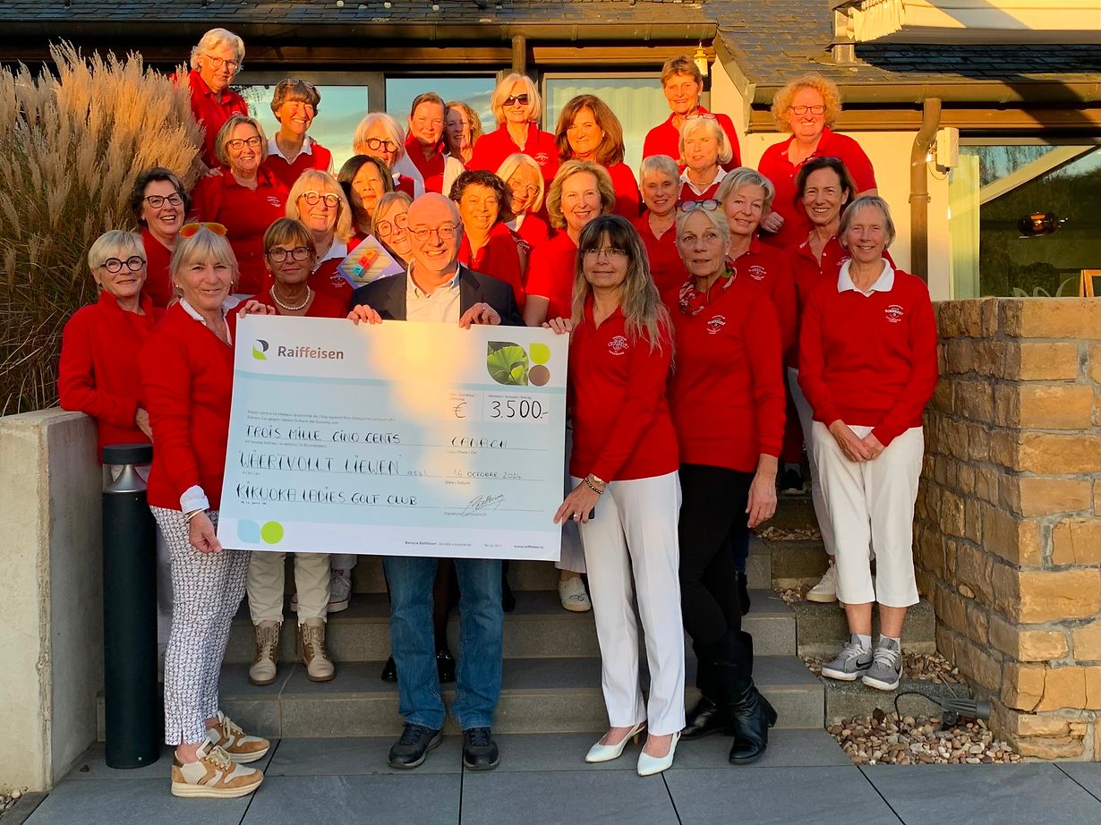 Canach Scheckiwerreechung 16/10/2024 - Kikuoka Ladies Golf Danielle De Clercq Publié le samedi 19 octobre 2024 à 12:48 Canach Lenningen, Luxembourg Dammen vum Kikuoka Golf hun e Scheck vun 3.500€ un "Wäertvollt Liewen a.s.b.l." iwerreecht. Signaler contenu inapproprié Plus de nouvelles de Danielle De Clercq > Scheckiwwerreechung 26/10/23 Canach Remise de chèque du Club de Golf Kikuoka à Canach au profit de Télos Education 14/12/22 Canach