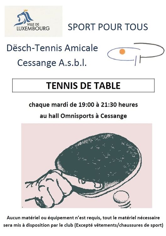 Luxembourg - Cessange Sport pour tous - tennis de table Roland Altmann Publié le dimanche 24 novembre 2013 à 20:58 Chaque mardi le DT Amiclae Cessange organise dans le cadre de l'action "Sport pour tous" de la Ville de Luxembourg des séances de tennis de table au hall omnisports de Cessange Signaler contenu inapproprié Plus de nouvelles de Roland Altmann > Nach vielen Jahren wieder in der zweithöchsten Spielklasse 28/06/17 Luxembourg - Cessange Jugendtraining des DT Amicale Cessange 24/11/13 Luxembourg - Cessange Kannerfuesbal den 12 Februar am Centre Culturel zu Zéisseng 05/02/12 Luxembourg - Cessange Cessinger Vereine spenden 7000 Euro 11/01/11 Luxembourg - Cessange