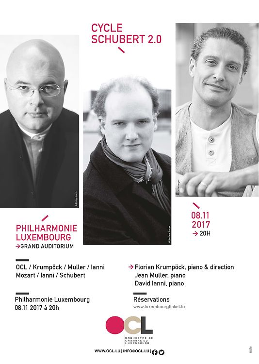 Le cycle philharmonique Schubert 2.0 de l’OCL débutera le 8 novembre 2017 à 20h avec un concert prestigieux dans le Grand Auditorium de la Philharmonie. Lors de ce concert, qui marquera le début du cycle complet des symphonies de Schubert par l’OCL, le public pourra non seulement découvrir la quasi inédite Symphonie No7 en mi majeur D 729 de Franz Schubert (dans l’orchestration moderne de Brian Newbould), mais il pourra également entendre une création mondiale du compositeur luxembourgeois David Ianni, Cloud of Unknowing. Le concert sera placé sous la direction du nouveau chef principal de l’orchestre Florian Krumpöck, qui pour ce concert exceptionnel prendra également place au piano. Il sera rejoint par Jean Muller et David Ianni, pour l’interprétation des concerti pour 2 et 3 pianos de Wolfgang Amadeus Mozart. Un événement à ne pas manquer!