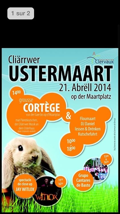 14:00 grousse cortège vun der Gare bis op d'Maartplaz mat Päerdskutschen, der Cliärrwer Musik an dem Usterhaas deen Ustereër verdeelt.
