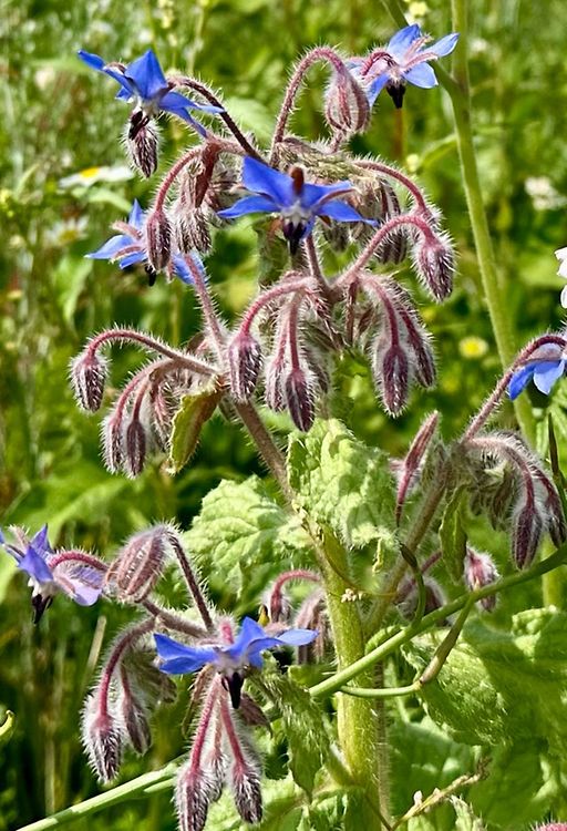 La bourrache, Borago officinalis (famille des Boraginacées), est une plante annuelle dont les tiges velues (son nom vient du latin borra, qui signifie poil) portent de grandes feuilles vert clair qui répandent une odeur de concombre si on les froisse.