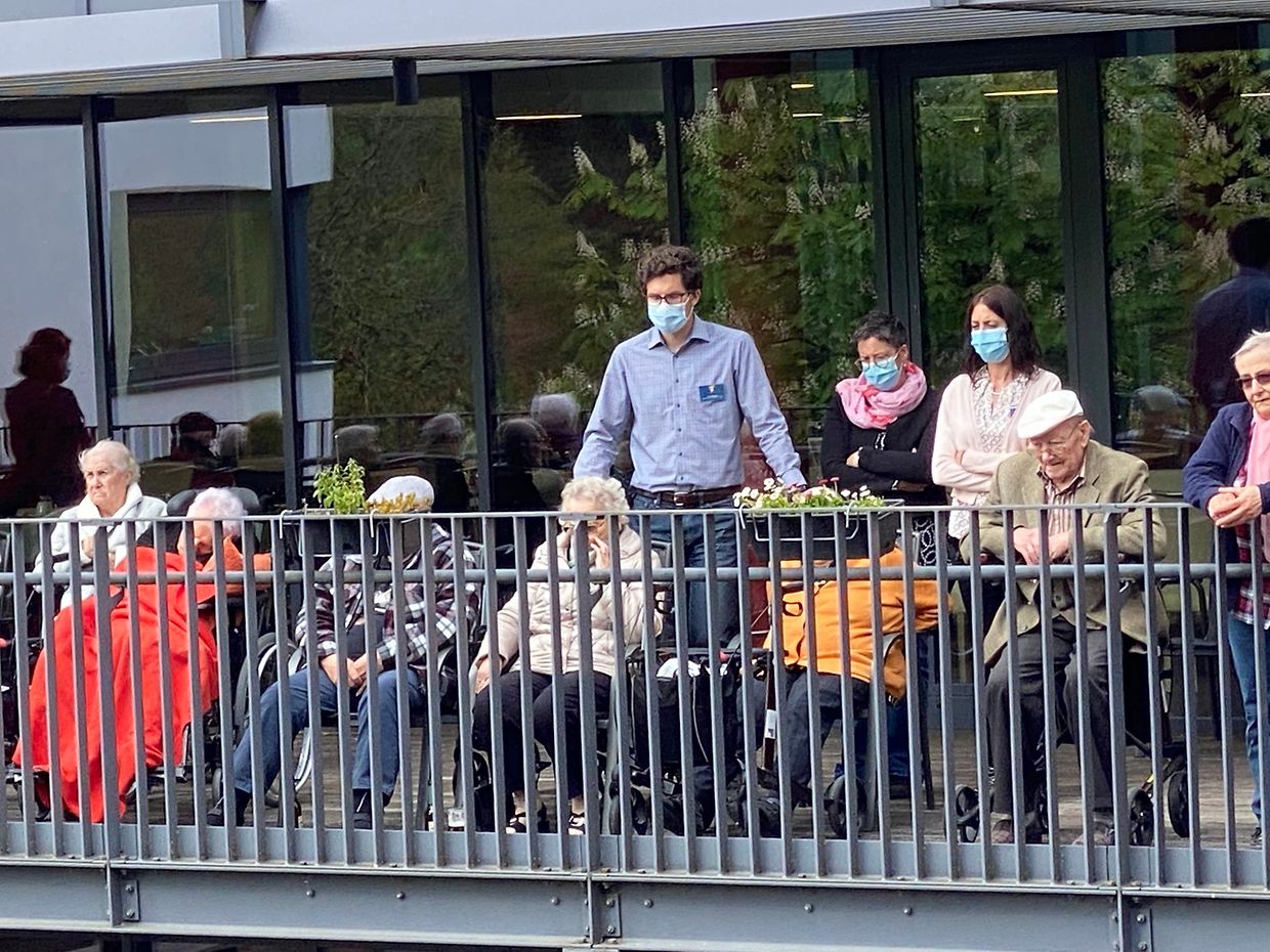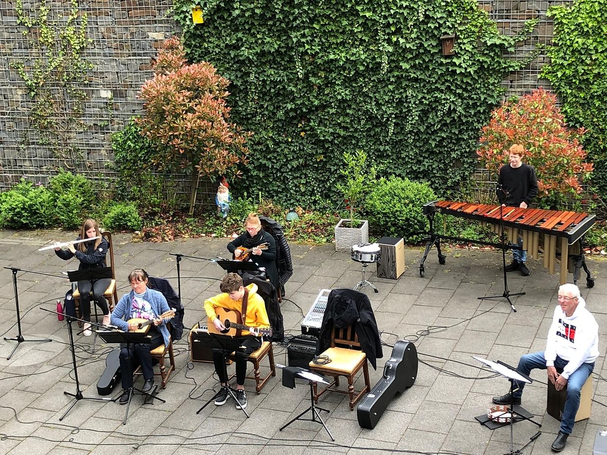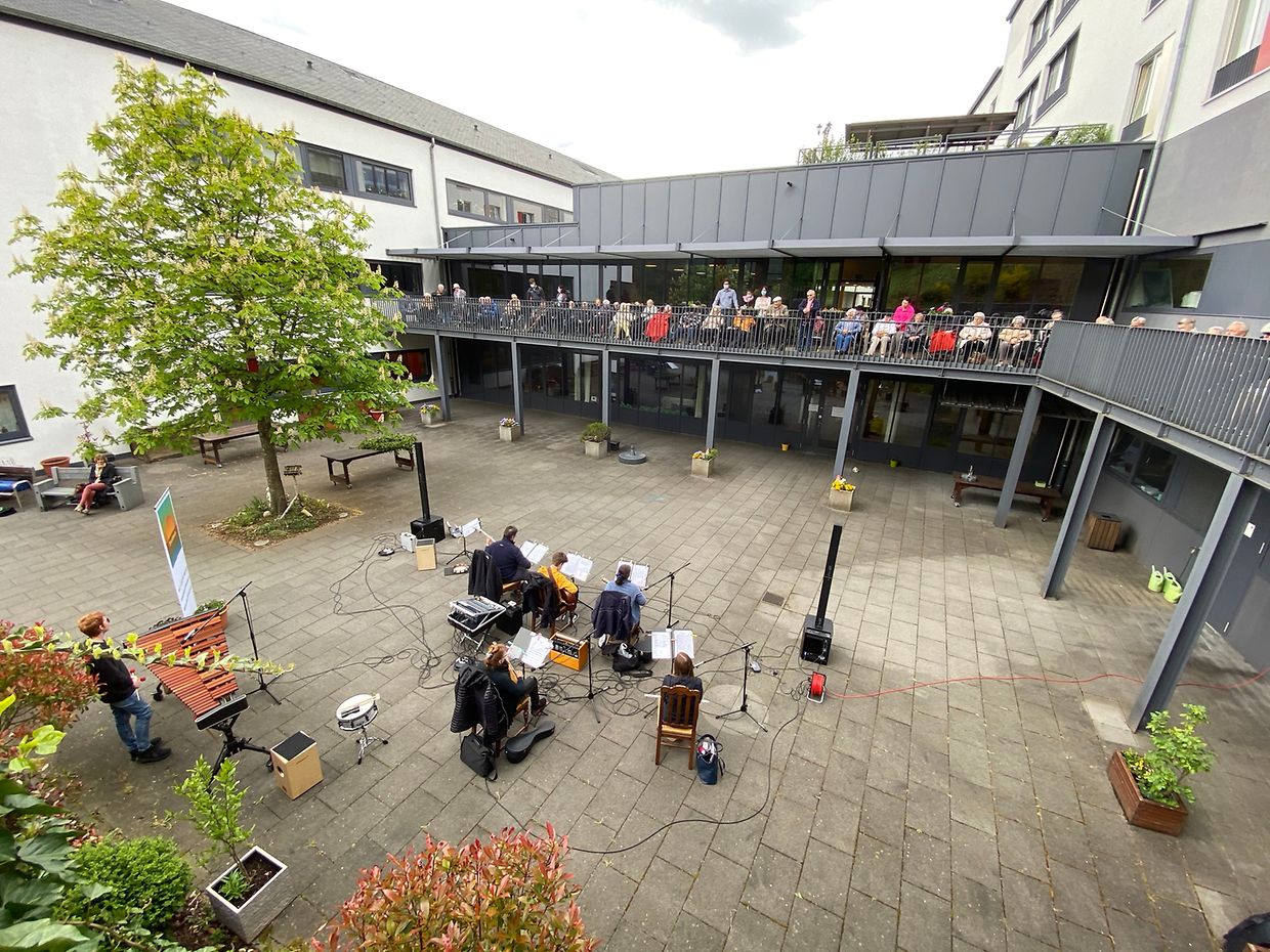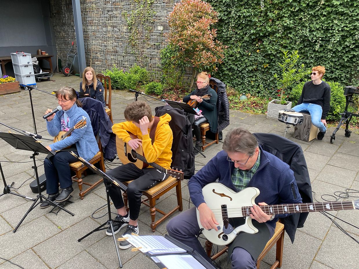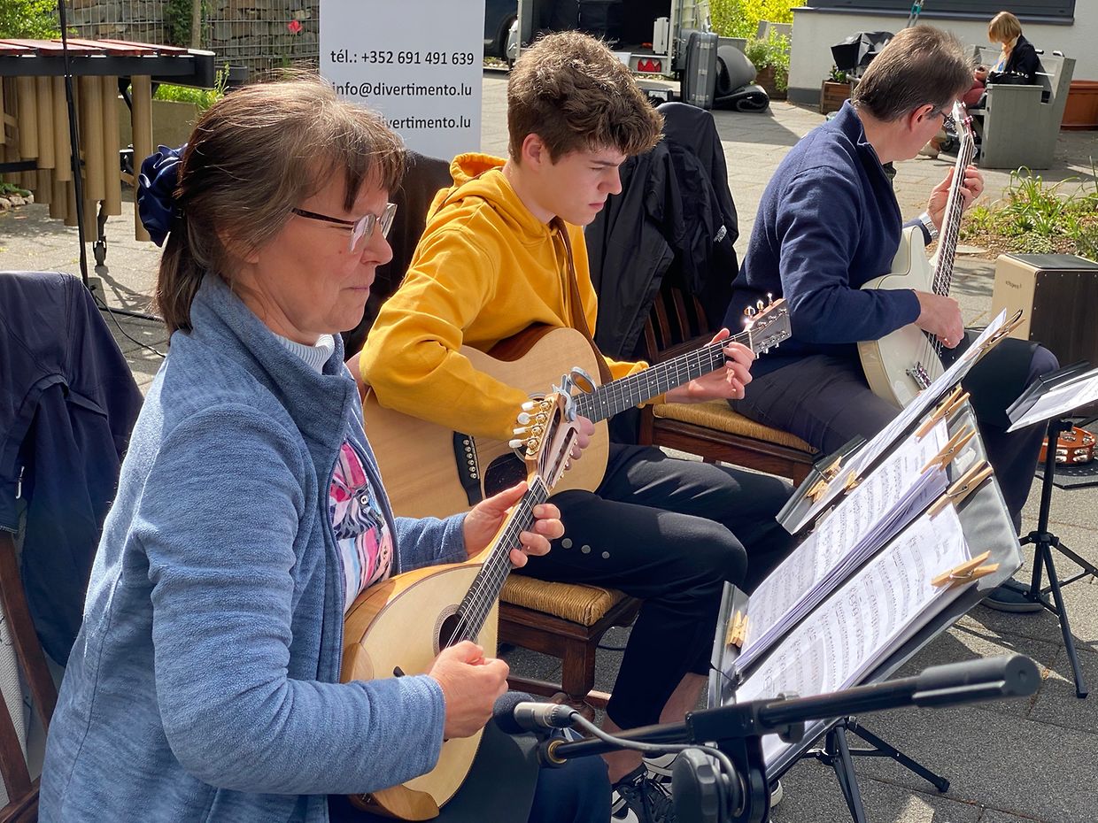 Bei herrlichem Sonnenschein spielte das Musikensemble Divertimento unter der Leitung von Isabelle Merlevede im HPPA St Joseph in Clerf zum Konzert auf. Alle Bewohner des schicken Heims hatten sich auf der großen Terrasse rundum den Innenhof eingefunden und genossen die musikalischen Leckerbissen vorgetragen auf Mandoline, klassischer Gitarre, Bass-Gitarre, Marimba, Querflöte und Cajon. Bestbekannte Schlager- und Filmmelodien aus der Feder der Leiterin Isabelle Merlevede begeisterten die zahlreichen Zuhörer, unter ihnen die 100 jährige Bertha Mentgen-Pütz, und brachten so manchen zum Mitsingen und Taktschlagen. Ein gelunger Nachmittag für alle Bewohner in dieser speziellen Zeit wo die Kontakte mit der Aussenwelt sehr eingeschränkt sind. Mit viel Applaus bedankten sich Personal und Bewohner bei den Musikanten für diesen musikalischen Lichtblick und verlangten drei Zugaben, die die Musiker mit großer Freude vortrugen. Im Nanem der Direktion lobte Nadine Reitz die sehr anspruchsvollen Interpretationen und lud das Musikensemble Divertimento zu einem Weihnachtskonzert ins HPPA St Joseph nach Clerf ein.