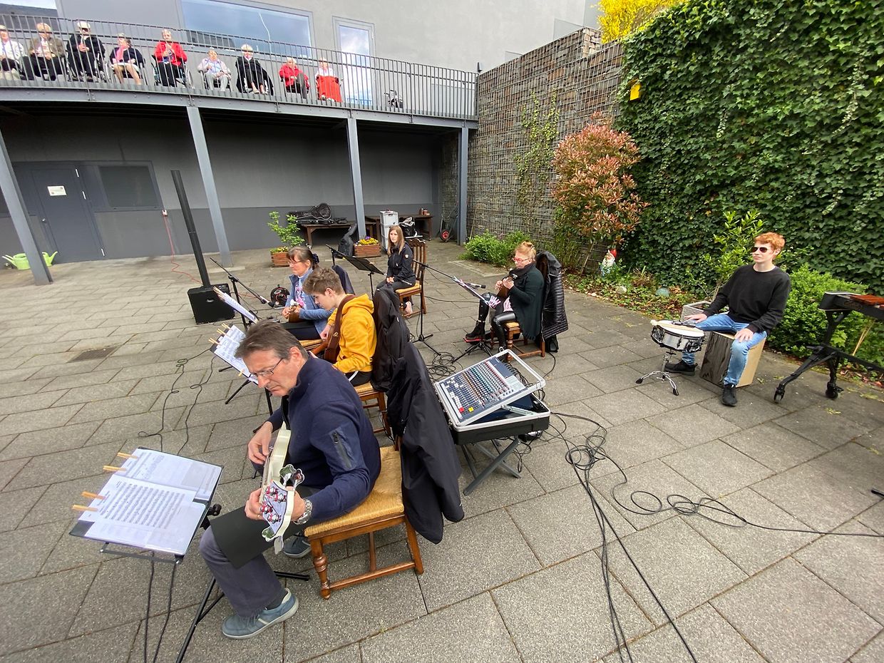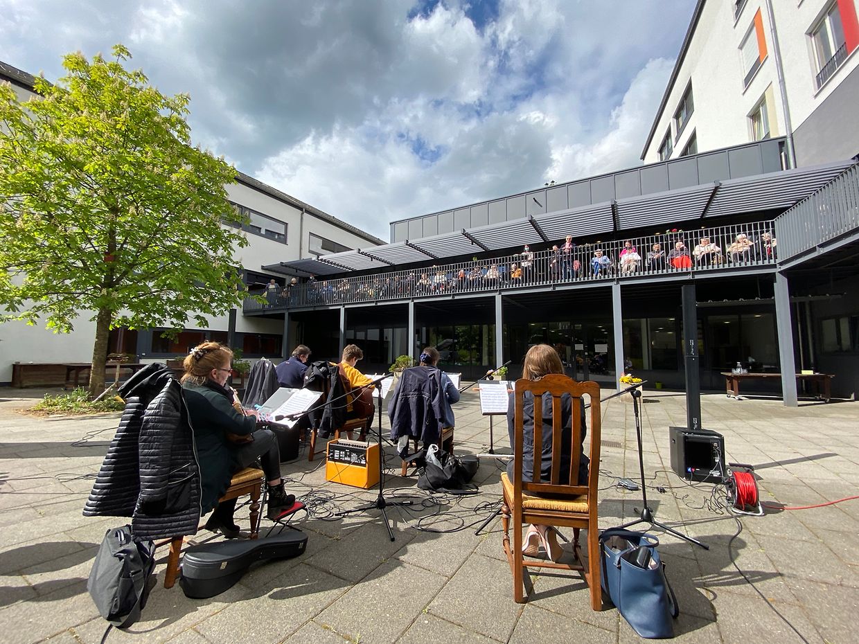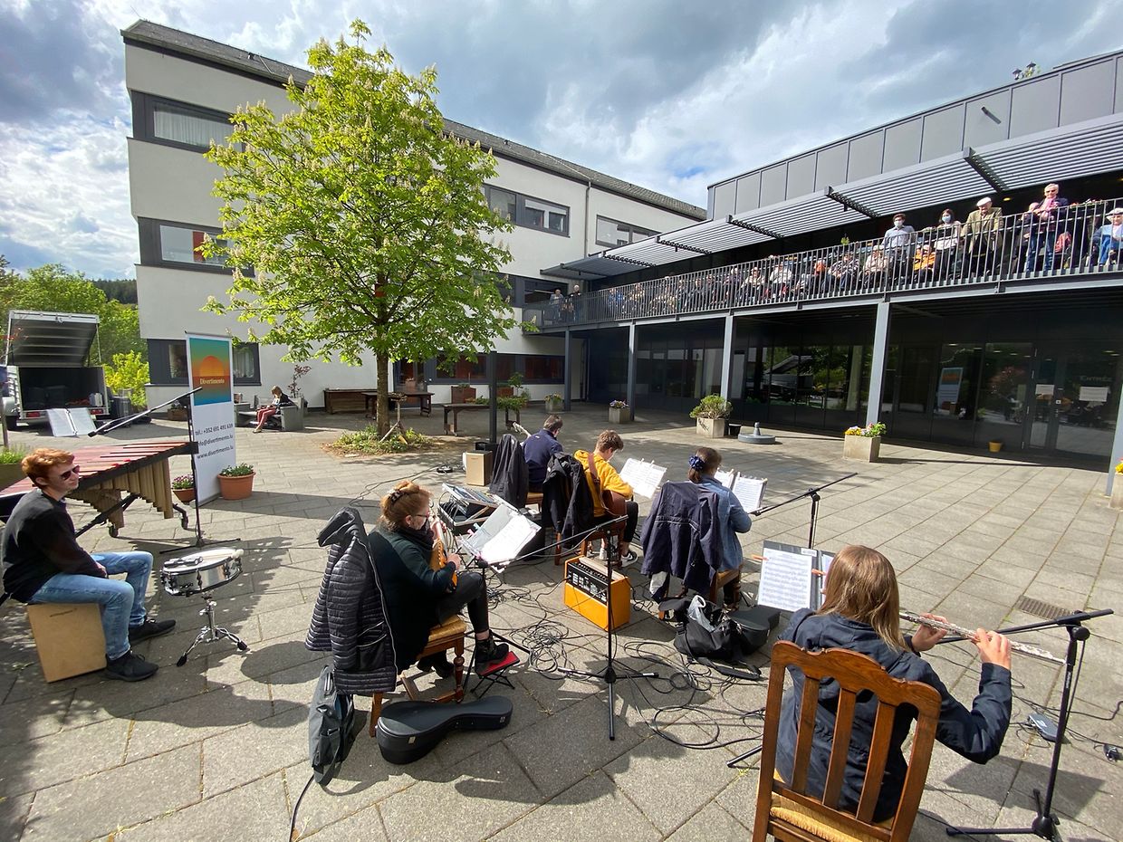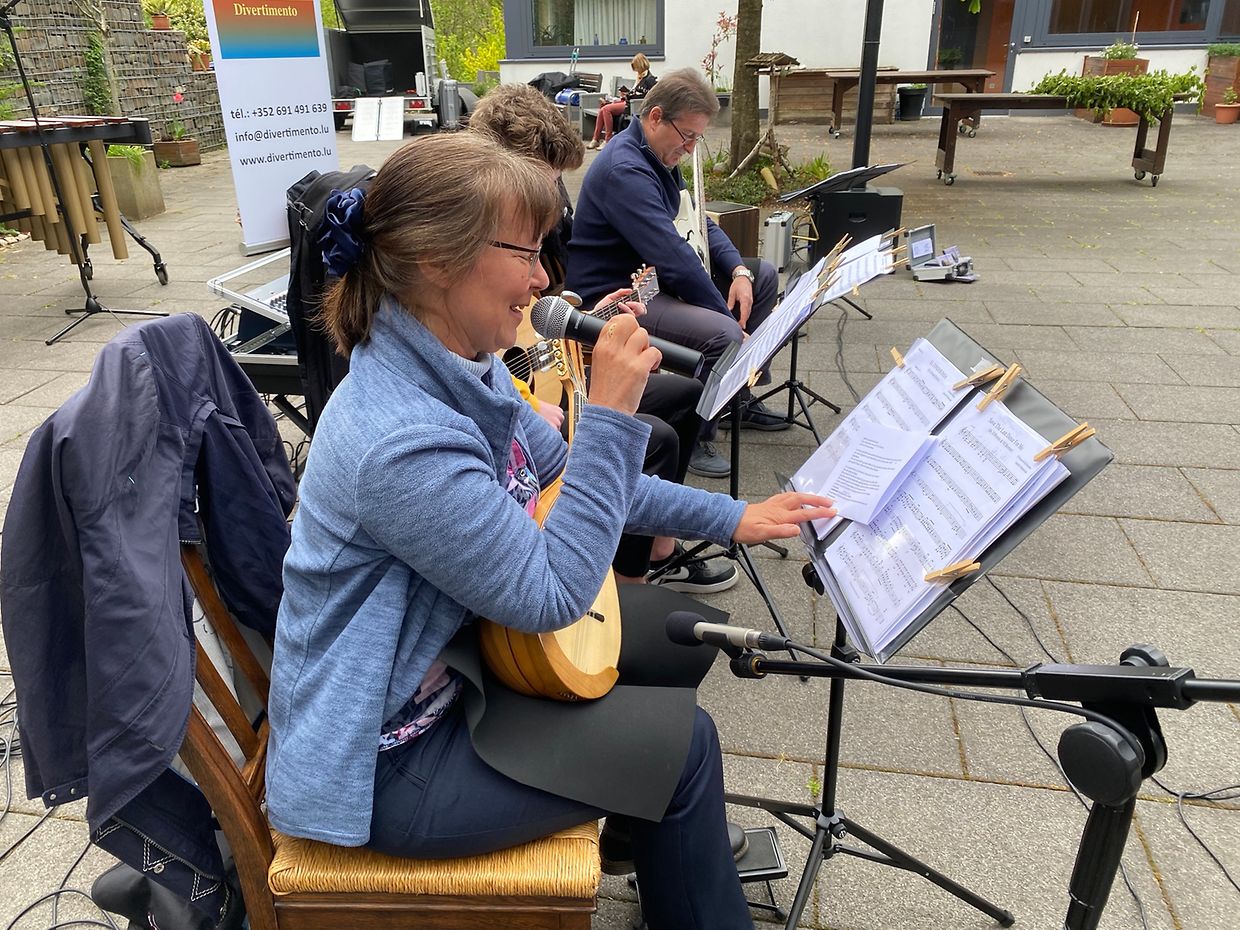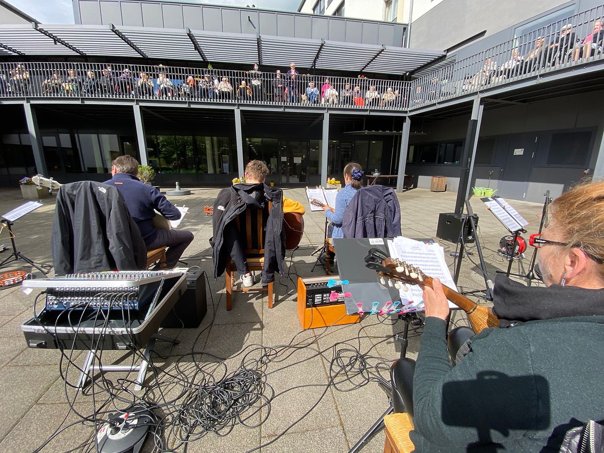 Bei herrlichem Sonnenschein spielte das Musikensemble Divertimento unter der Leitung von Isabelle Merlevede im HPPA St Joseph in Clerf zum Konzert auf. Alle Bewohner des schicken Heims hatten sich auf der großen Terrasse rundum den Innenhof eingefunden und genossen die musikalischen Leckerbissen vorgetragen auf Mandoline, klassischer Gitarre, Bass-Gitarre, Marimba, Querflöte und Cajon. Bestbekannte Schlager- und Filmmelodien aus der Feder der Leiterin Isabelle Merlevede begeisterten die zahlreichen Zuhörer, unter ihnen die 100 jährige Bertha Mentgen-Pütz, und brachten so manchen zum Mitsingen und Taktschlagen. Ein gelunger Nachmittag für alle Bewohner in dieser speziellen Zeit wo die Kontakte mit der Aussenwelt sehr eingeschränkt sind. Mit viel Applaus bedankten sich Personal und Bewohner bei den Musikanten für diesen musikalischen Lichtblick und verlangten drei Zugaben, die die Musiker mit großer Freude vortrugen. Im Nanem der Direktion lobte Nadine Reitz die sehr anspruchsvollen Interpretationen und lud das Musikensemble Divertimento zu einem Weihnachtskonzert ins HPPA St Joseph nach Clerf ein.
