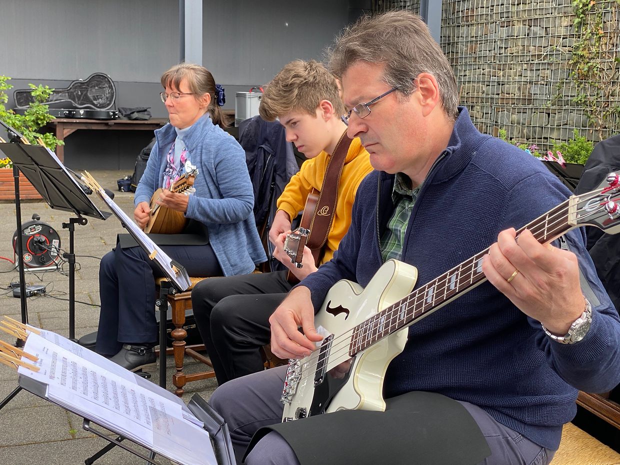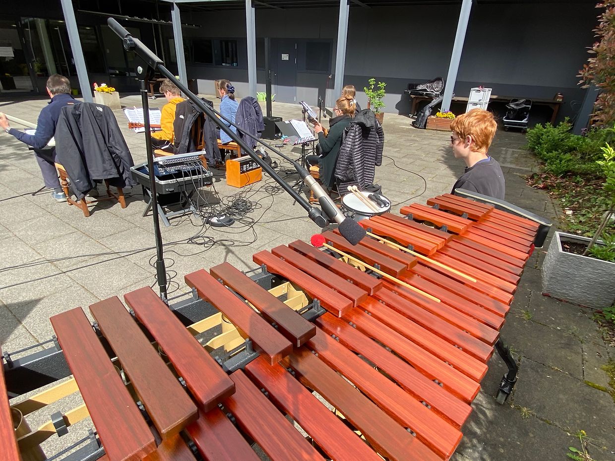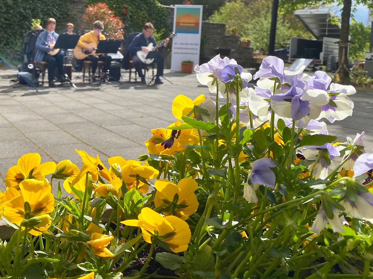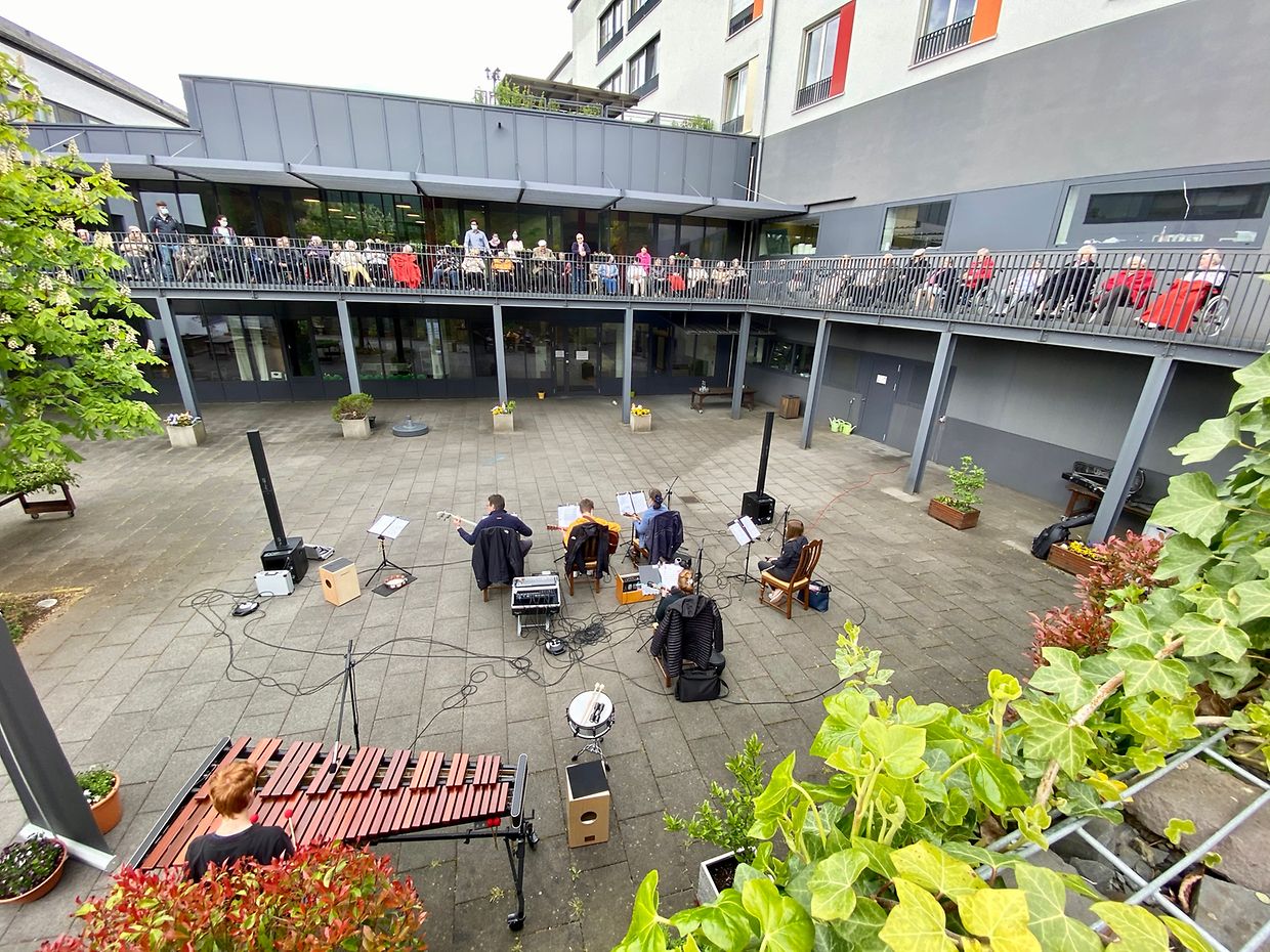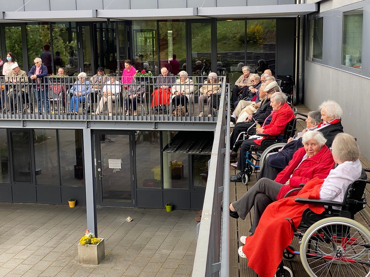 Bei herrlichem Sonnenschein spielte das Musikensemble Divertimento unter der Leitung von Isabelle Merlevede im HPPA St Joseph in Clerf zum Konzert auf. Alle Bewohner des schicken Heims hatten sich auf der großen Terrasse rundum den Innenhof eingefunden und genossen die musikalischen Leckerbissen vorgetragen auf Mandoline, klassischer Gitarre, Bass-Gitarre, Marimba, Querflöte und Cajon. Bestbekannte Schlager- und Filmmelodien aus der Feder der Leiterin Isabelle Merlevede begeisterten die zahlreichen Zuhörer, unter ihnen die 100 jährige Bertha Mentgen-Pütz, und brachten so manchen zum Mitsingen und Taktschlagen. Ein gelunger Nachmittag für alle Bewohner in dieser speziellen Zeit wo die Kontakte mit der Aussenwelt sehr eingeschränkt sind. Mit viel Applaus bedankten sich Personal und Bewohner bei den Musikanten für diesen musikalischen Lichtblick und verlangten drei Zugaben, die die Musiker mit großer Freude vortrugen. Im Nanem der Direktion lobte Nadine Reitz die sehr anspruchsvollen Interpretationen und lud das Musikensemble Divertimento zu einem Weihnachtskonzert ins HPPA St Joseph nach Clerf ein.