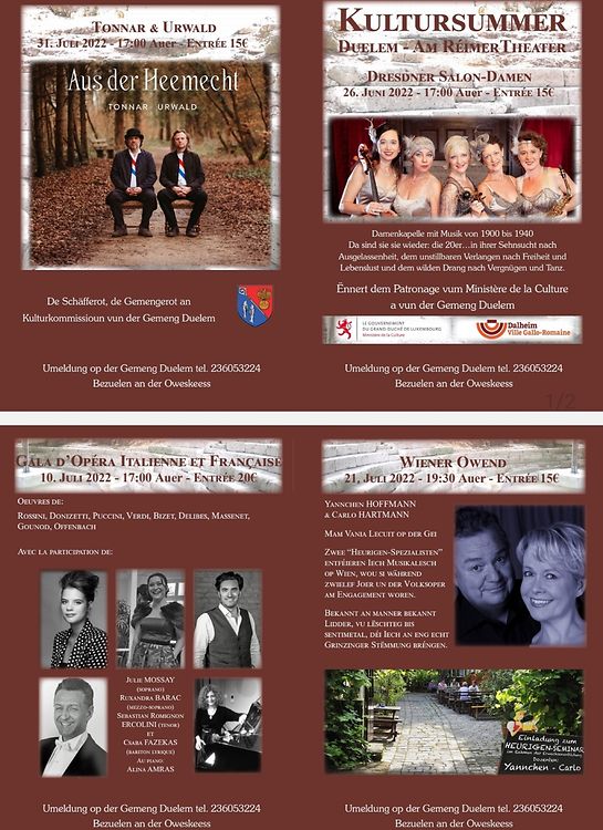 D'Kulturkommissoun vun der Gemeng Duelem an Zesummenaarbecht mat hierem Schäffen- a Gemengerot huet och erëm fir dëst Joer 4 flott Concerten an hierem Réimertheater geplangt.