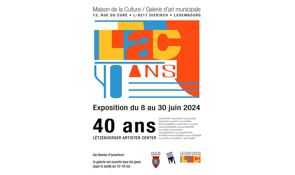 Pour célébrer cette étape remarquable, le LAC organise une exposition spéciale intitulée "40 ans Lëtzebuerger Artisten Center", qui se tiendra du 8 au 30 juin 2024 à la Maison de la Culture / Galerie d’art municipale à Diekrch. Cette exposition mettra en vedette un éventail éblouissant d'œuvres d'art, notamment des peintures, des photographies, des sculptures et des œuvres graphiques, créées par un groupe sélectionné d'artistes associés au LAC.