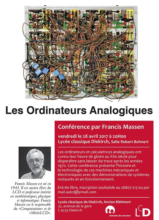 Le vendredi 28 avril une conférence sur les ordinateurs et calculatrices analogiques sera présentée par Francis Massen, professeur e.r. du LCD et responsable du Computarium. Ce type de calculateurs et d'ordinateurs a permis de résoudre des problèmes complexes de régulation et de simulation a une période où le calcul digital était encore inconnu ou trop peu performant.