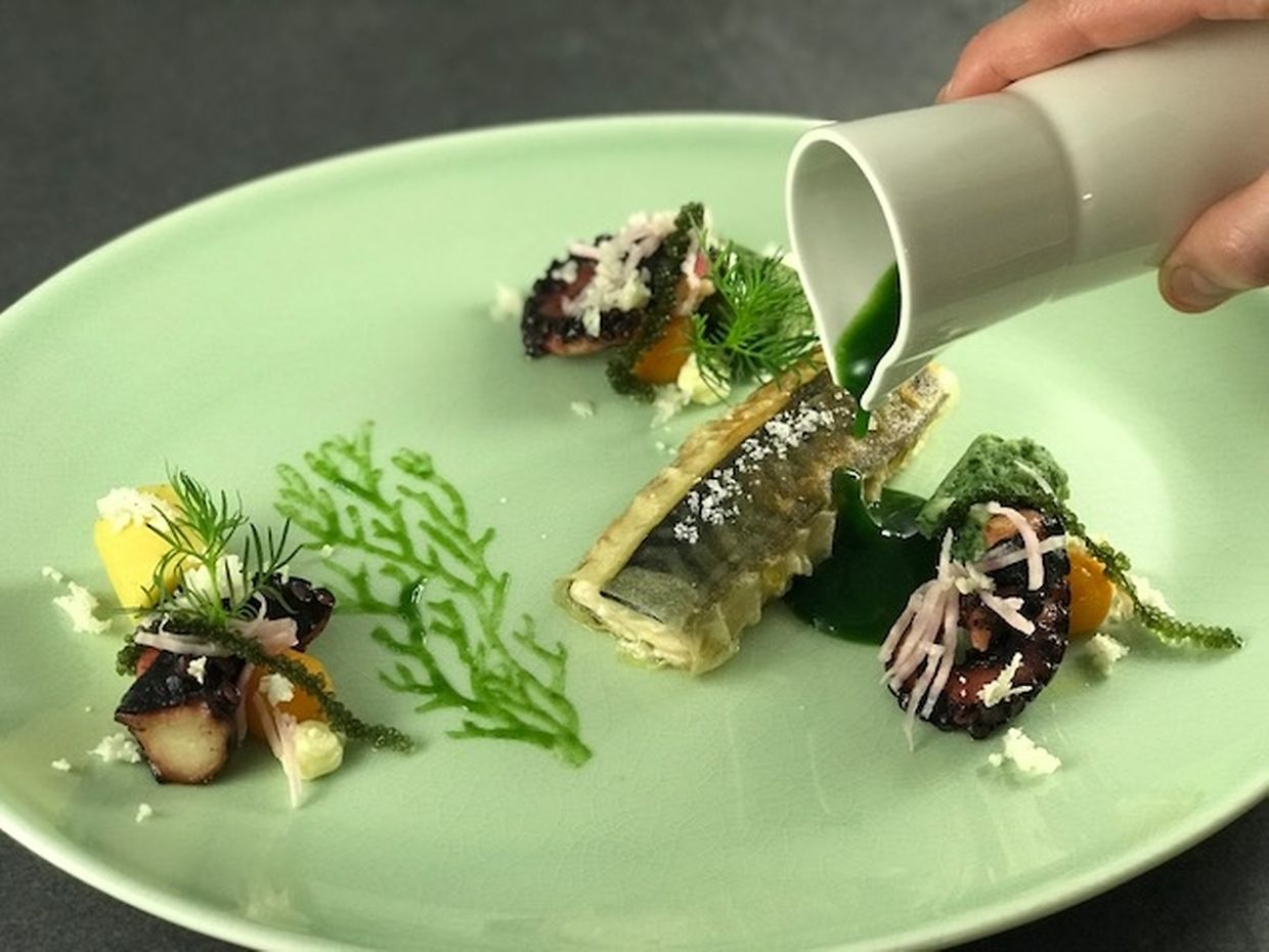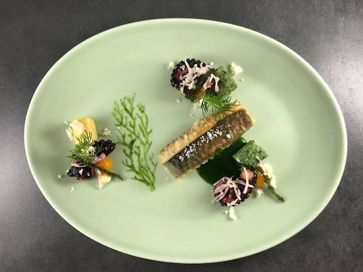 Pour l’épreuve pratique elle a fait une réalisation de type gastronomique à base de maquereau, accompagné de poulpe et de groseille de la mer.