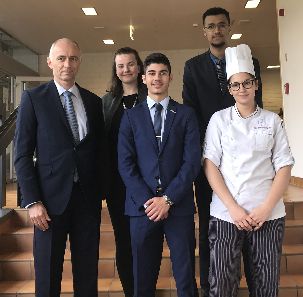 En ce lundi matin, toute la communauté scolaire de l'École d'Hôtellerie et de Tourisme du Luxembourg avait été invitée par la direction à un verre organisé en honneur des élèves qui se sont distingués par des prestations exceptionnelles au cours des derniers mois. En effet, encadrés et entraînés par leurs professeurs, des élèves suivant une formation de cuisiniers, de restaurateurs ou d'hôteliers ont pu démontrer leurs compétences et leur talent à l'occasion de différents concours internationaux et se classer parmi les meilleurs: une médaille d'or au Concours Bartolomeo Scappi, une première place au Concours Maitrank, et la présence parmi les lauréats du Concours Olivier Roellinger qui seront récompensés le 8 juin prochain à Paris. Ces événements représentent l'occasion de se mesurer à d'autres jeunes, mais aussi de voyager, de nouer des contacts professionnels et de décrocher des stages à l'étranger.