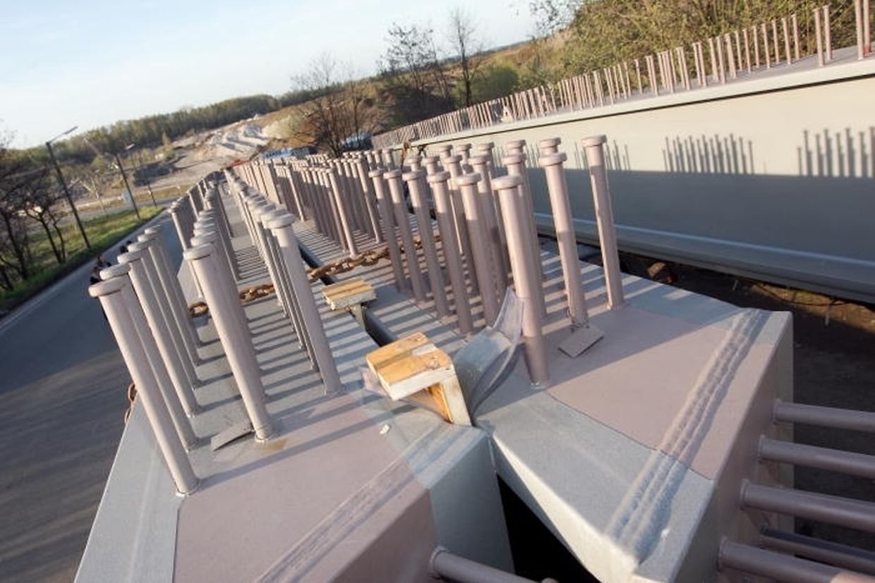 Nachdem der Eisenbahnverkehr an der Baustelle in Köthen vorübergehend eingestellt und die Hochspannungsleitung abgeschaltet wurden, werden die Grey-Träger über den Eisenbahngleisen angebracht. Die Träger werden nebeneinander gelegt und miteinander verbunden. „Jeder Stahlträger ist mit 554 Kopfbolzendübeln versehen. Diese Bolzen dienen als Verbund zwischen dem Stahlträger und dem Betonbelag der Brücke“, informierte Christian Thiel, „Contract Manager & Quality Assurance Manager“ bei ArcelorMittal.
