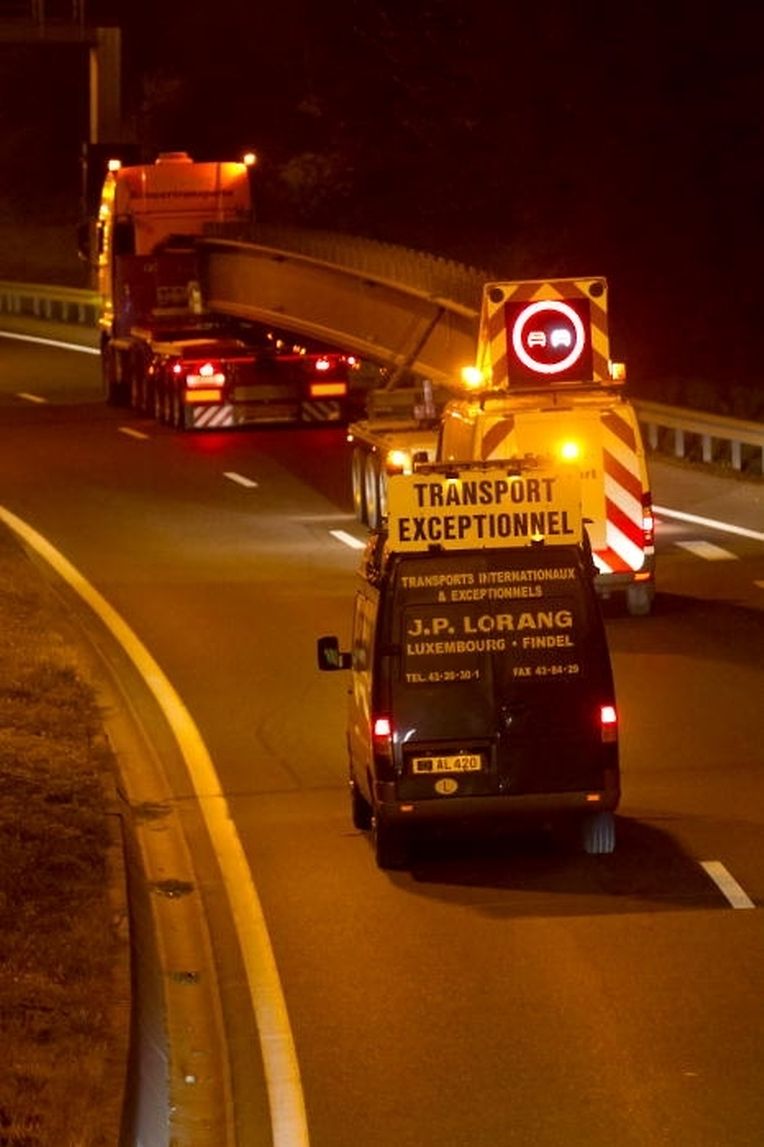 Mit mehr als einer Stunde Verspätung verließ der Konvoi mit den drei Schwertransportern und seinen luxemburgischen und deutschen Begleitwagen das Gelände des Differdinger Stahlwerks in Richtung „Collectrice du Sud“ A13. Auf Höhe der Industriezone „Gadderscheier“ mussten die Fahrer bereits ein erstes Mal ihr Fahrkönnen unter Beweis stellen. Da die Lastwagen wegen ihrer Länge nicht sofort nach rechts auf die Autobahnauffahrt in Richtung Esch/Alzette-Luxemburg abbiegen konnten, mussten sie zuerst vorwärts in die Industriezone „Gadderscheier“ fahren. „Nun fahren die Fahrer die Lastwagen rückwärts auf die N12 und in die Ausfahrt Differdingen der A13. Wenn sie sich dann in der richtigen Fahrtrichtung befinden, können sie problemlos auf die Autobahn rollen“, meinte vor Ort Volkmar Anspach, der Geschäftsführer der deutschen Schwerlast- und Transport-Logistikfirma. Und er sollte recht behalten. In weniger als einer Viertelstunde hatte der erste Fahrer das knifflige Wendemanöver mit seinem Gefährt unter der Anleitung von Speditionskollegen gemeistert, so dass er sich auf die A13 begeben konnte. Dort musste der Fahrer auf dem Standstreifen auf die übrigen Schwertransporter und Begleitfahrzeuge warten. Um 21.45 Uhr befanden sich schließlich alle Lastwagen und Begleitwagen auf der Autobahn bzw. in der Auffahrt, so dass der Konvoi mit einer Geschwindigkeit von 62 km/h weiterfahren konnte. Eine halbe Stunde später, gegen 22.15 Uhr mussten die Fahrer dann ein zweites heikles Manöver absolvieren, um von der A13 auf die A4 aufzufahren.