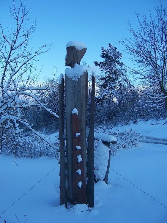 Dës Skulptur vum Marie-Josée Kerschen kuckt sehnsüchtig vun Draufelt ob Klierf. Zu Klierf, um Daach vum Sonnenhaus, Foyer de Jour pour Personnes Handicapées, ass hiirt Doheem.